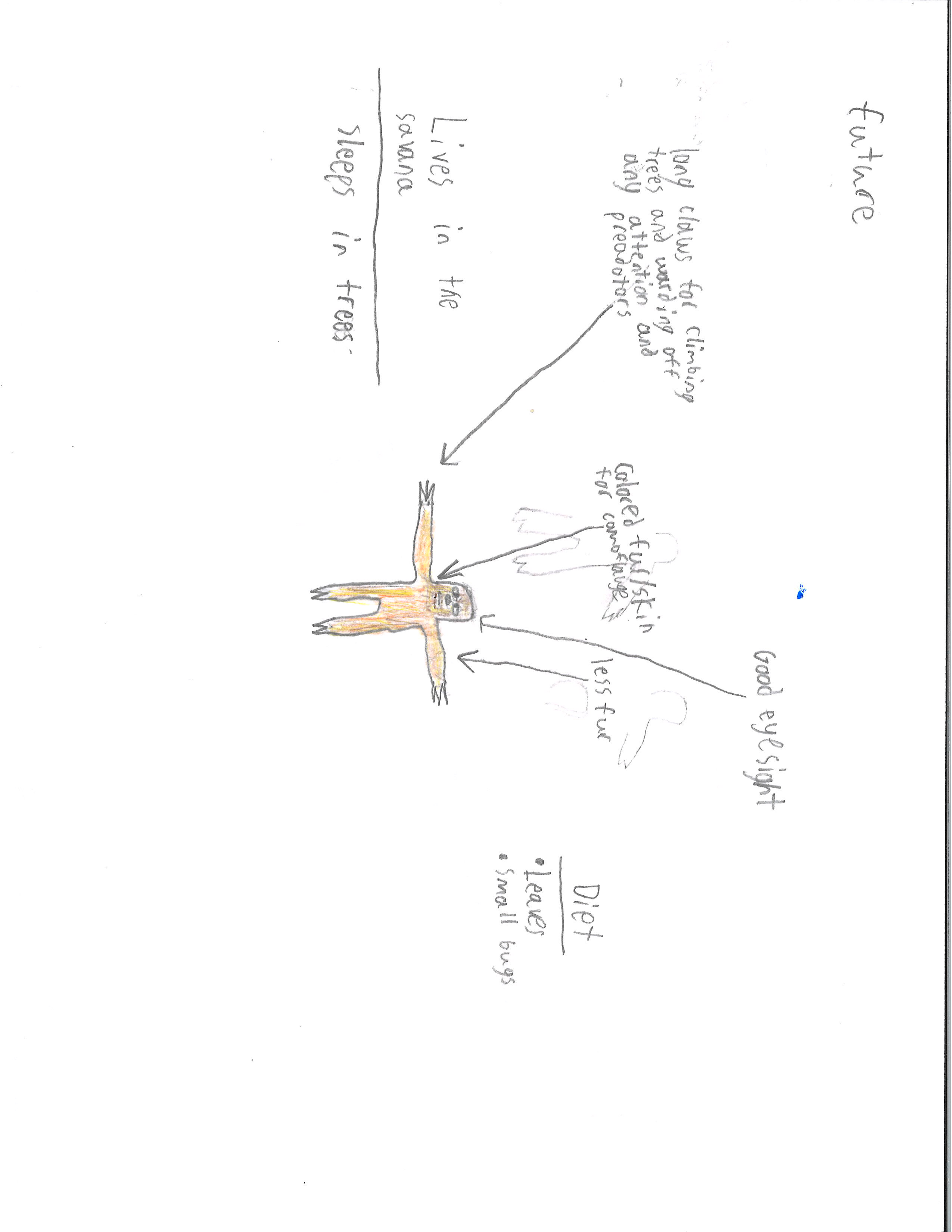 The animal that I chose for this project is the sloth because I think it would be interesting to see how a sloth would change in 1000 years. In the future the sloth would be a little faster moving and have good eyesight so that he could spot potential threats. His fur is the color of the grass so he can sneak wherever he needs to go. The future environment has changed to a savannah because of global warming and deforestation. The sloth has been forced to adapt because there will be fewer trees to provide cover. He will have a lot less fur due to the hot sun and will live near any trees or available large bushes. He will still eat leaves, but will also eat bugs if necessary.