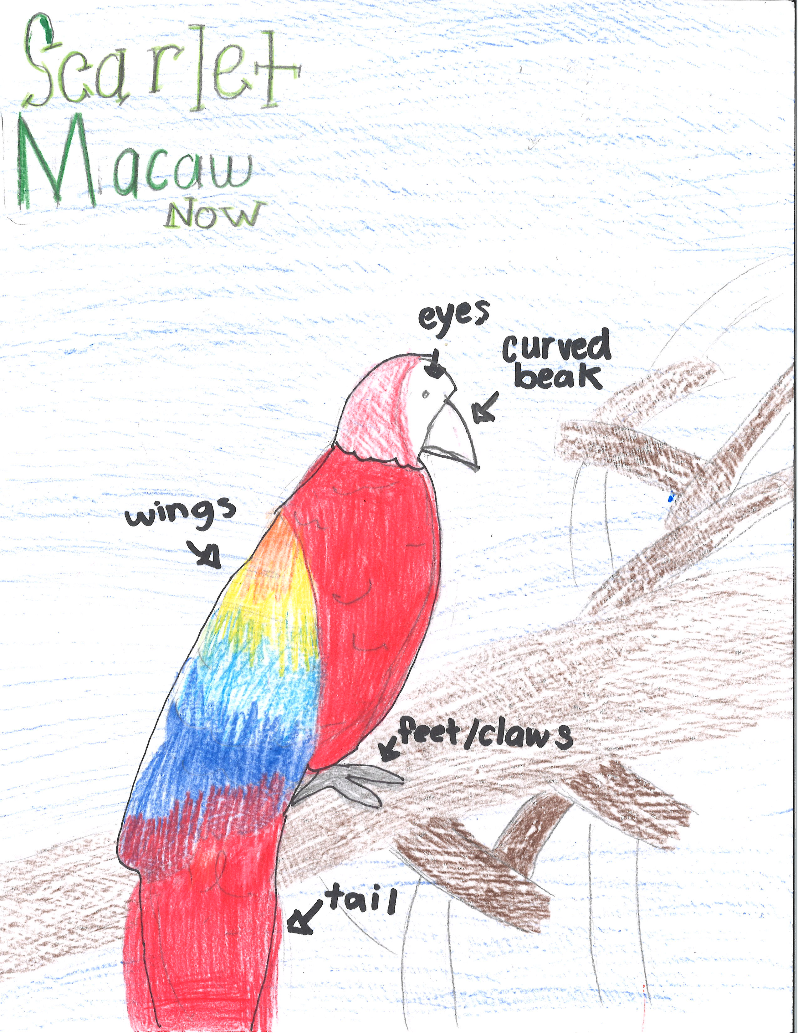 Today the Scarlet Macaw has a curved beak for cracking nuts, grooming, gripping, and defense. The wings are used for flying, communication, and camouflage. The feet are used for gripping, support, and manipulation. The eyes are used for sight. The tail is used for flight balance and steering. They live in the rainforest.