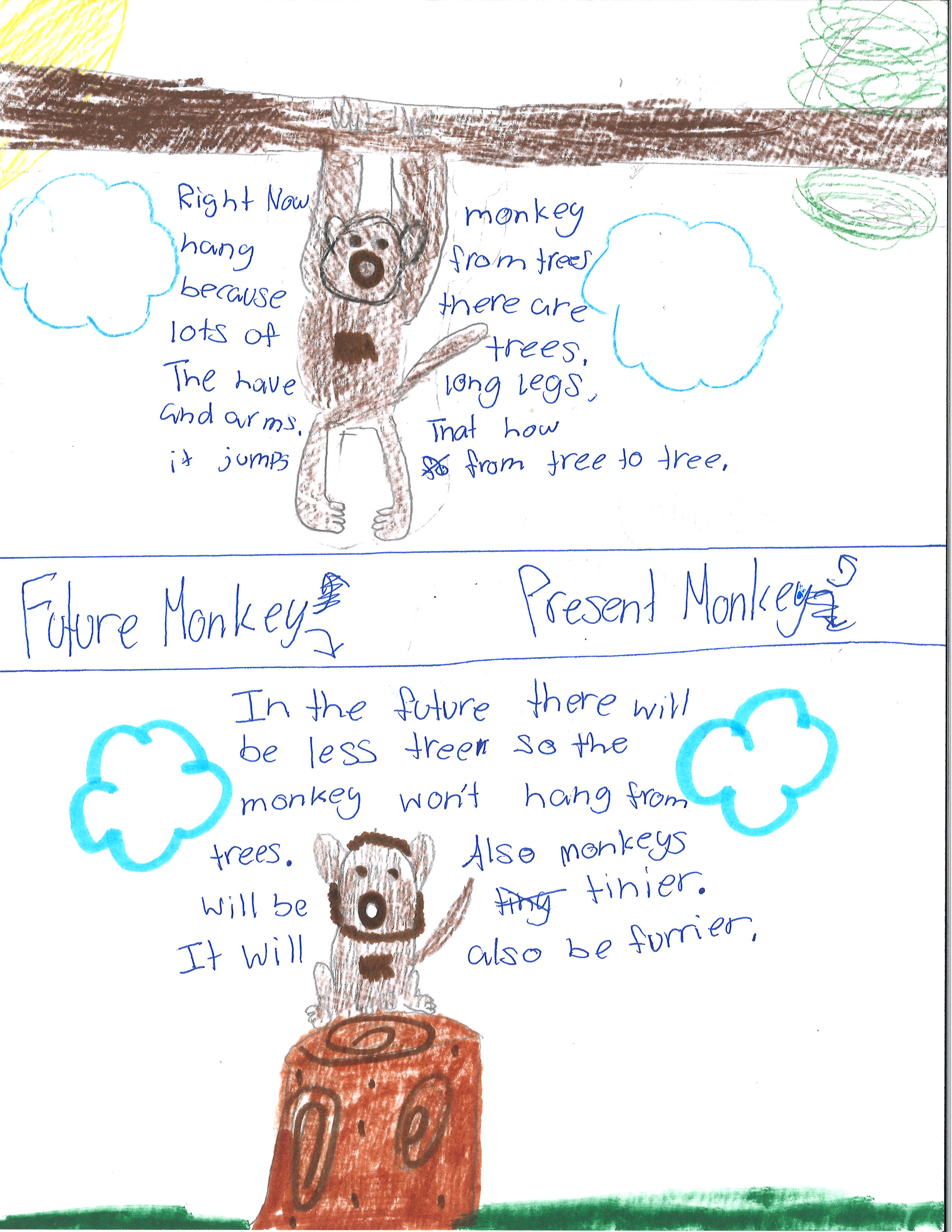 In the future there will be less trees so the monkeys won't hang from the trees. Also monkeys will be tinier and furrier.