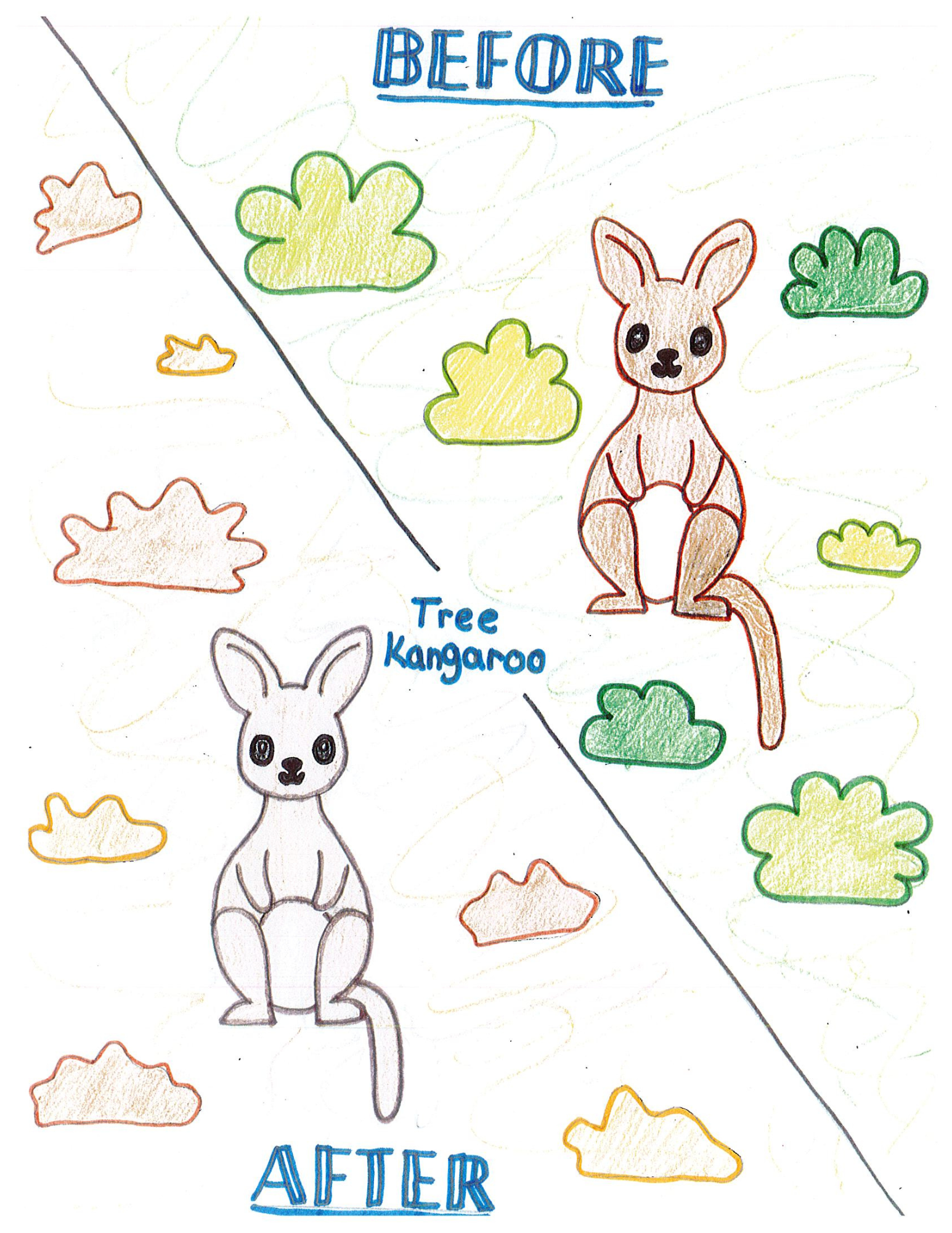 My image is of a Tree Kangaroo before and a “Camaroo” after climate change. I predict that this type of kangaroo, that lives in the rainforest, will camouflage to the conditions of its habitat, so it will adapt its color to a lighter brown. This animal will change its color to disguise itself to the trees or to the brown shrubs to hide from predators and to get food while it lasts. The habitat and rainforest around the Tree Kangaroo has started to die and the plants and shrubs have turned brown due to earth's conditions in the future. I believe that this will happen because when climate change has a full effect, it will be harder to get resources because most organisms are diseased. In conclusion, I predict this mammal will change its color to adapt to the dying habitat surrounding it, caused by climate change.