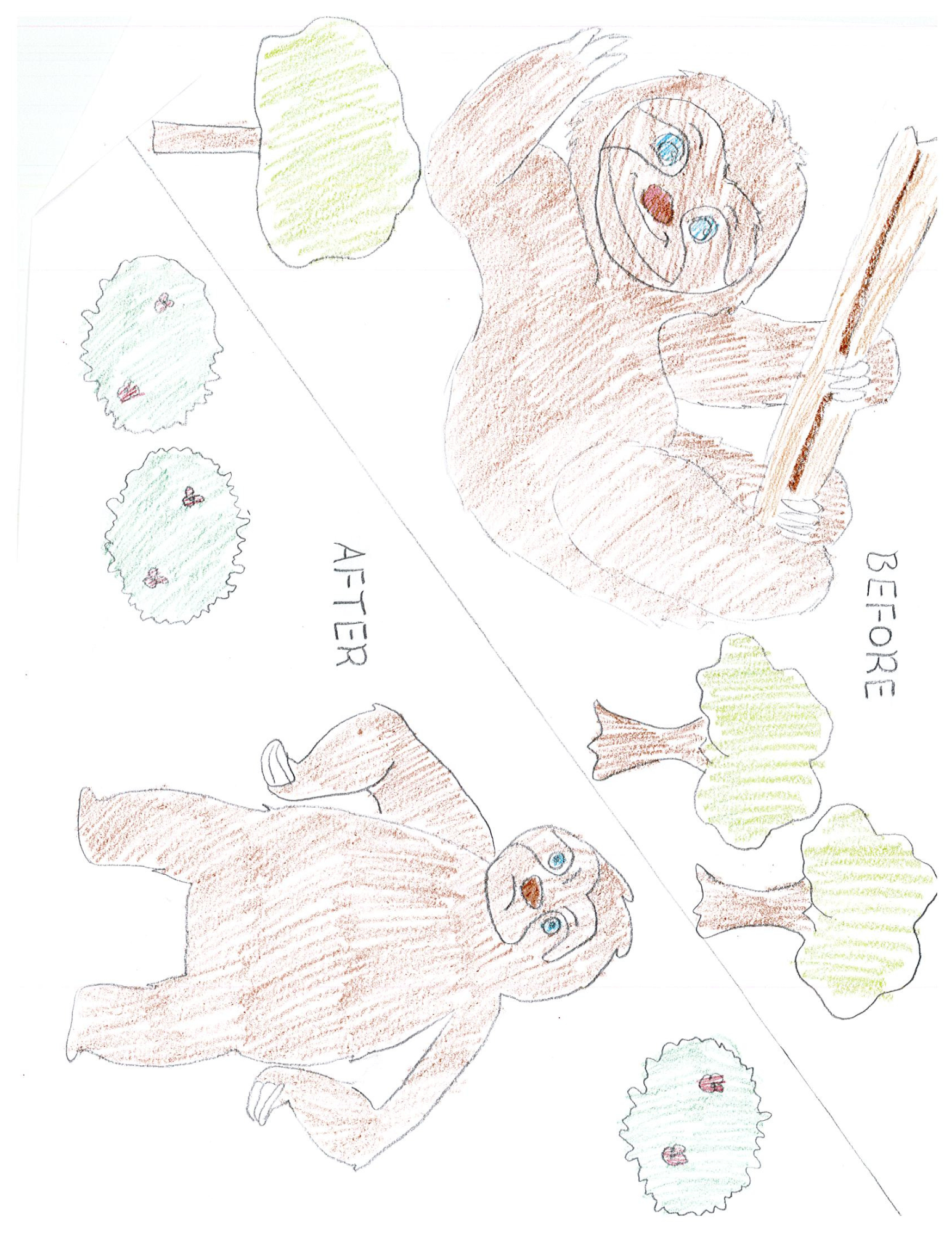 The sloth’s present habitat consists of many trees and branches. In the future, sloth’s may be endangered due to the lack of trees. Deforestation is an effect of human activity, and climate change. The sloth’s claws may adapt to the ground habitat and their diet could be different.
