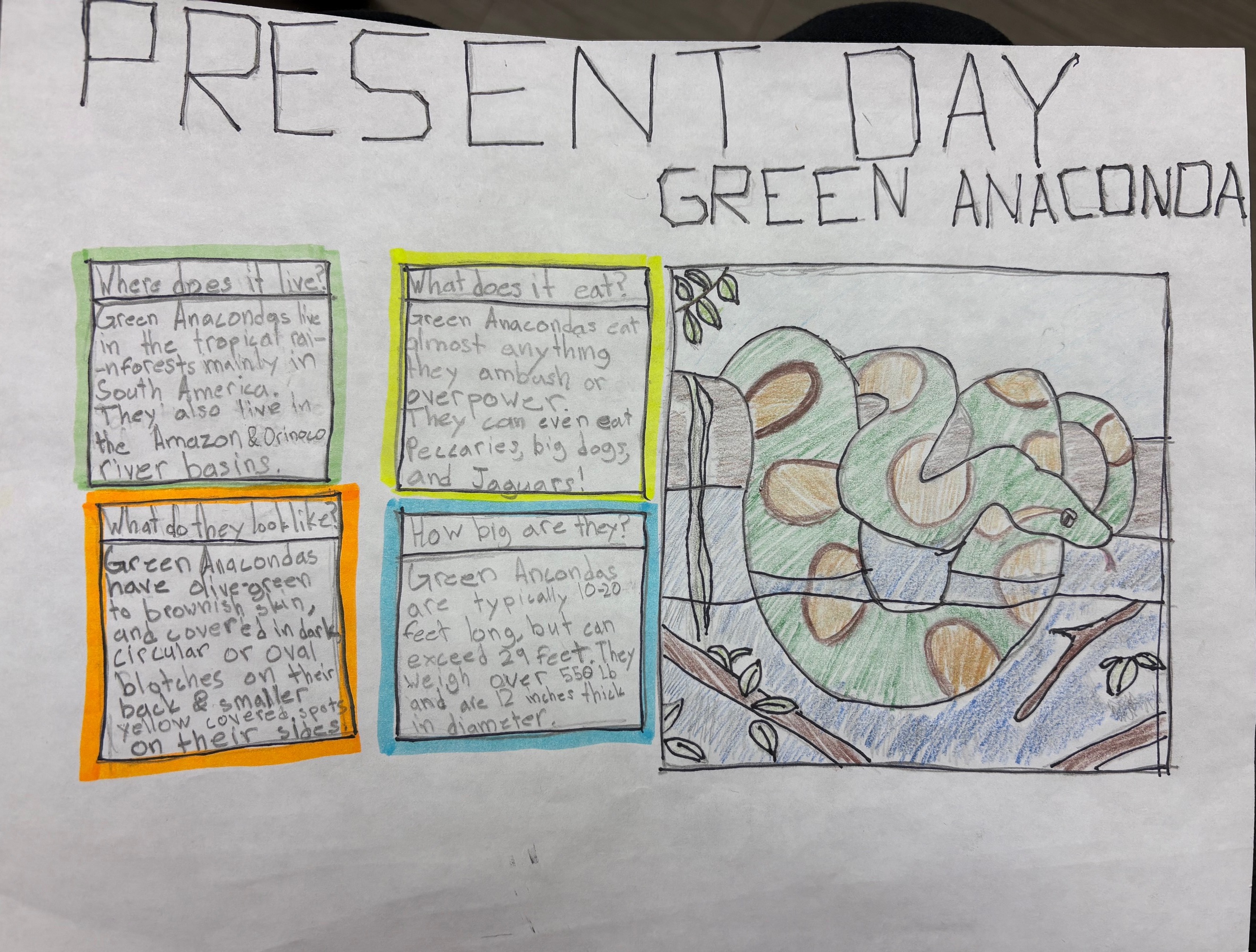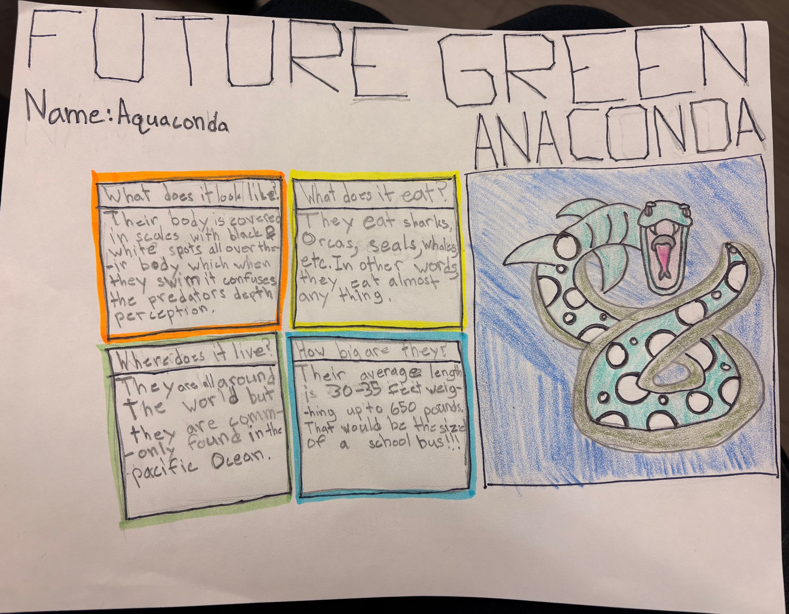 Global warming is melting icebergs which is causing the sea levels to rise. In this case the Green Anaconda will have to adapt to the ocean in the future. It will cause it to grow fins and gills, also changing its diet to sharks, whales, fish and other things.They have black and white spots on their body causing a “flicker” to predators.
