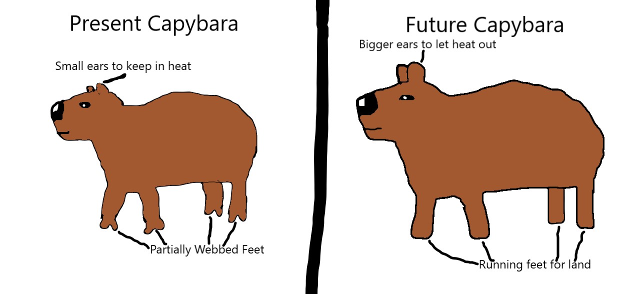 A capybara lives in a moist environment with places to swim in so they adapted to the environment by getting webbed feet, swimming from predators. A capybara also has high ears to hear better that helps it be alerted when a predator comes near. A capybara also has coarse, brittle fur to help them dry more quickly when they get wet. It is an advantage and disadvantage because the coolness from the water allows them to cool down and reduce sickness but they make them feel uncomfortable from the wetness. Climate change can affect the rainforest because if the water gets evaporated by the heat, then it will be more of a savanna rather than a rainforest. The capybara can adapt if their feet adapt to running by replacing the webs with claws The capybara will also form a hump on its back to store water and cool it’s body.