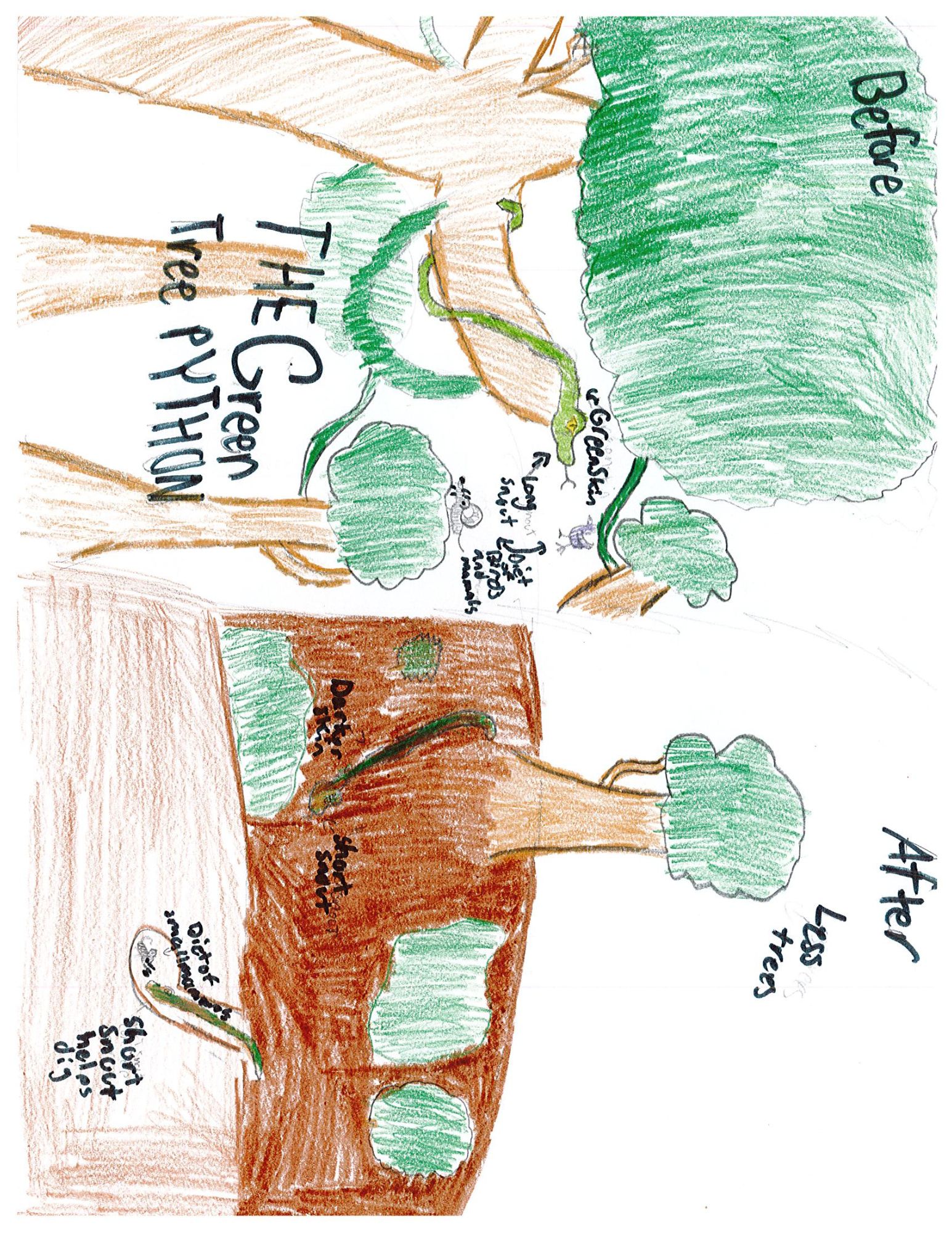 They have a long snout, bright green skin to blend in with vines, and a diet of small mammals and birds. Deforestation causes the tree habitats for the green tree python to change. The trees where it lived would be chopped down. The python’s skin would become a darker greenish brown to blend into the ground instead of vines. Its snout would be shorter to burrow underground. Its diet would not have birds anymore because they wouldn't live in the trees and the shorter snout would make them eat smaller animals.