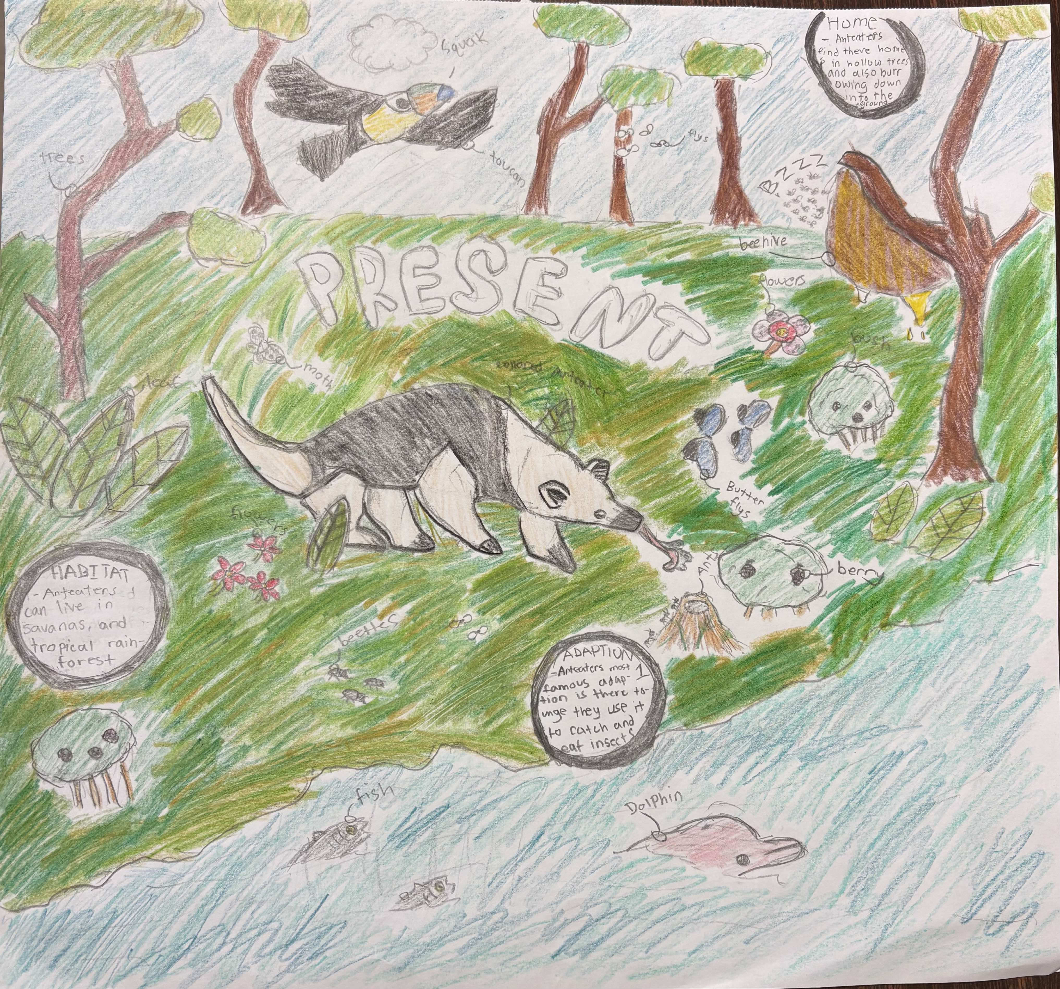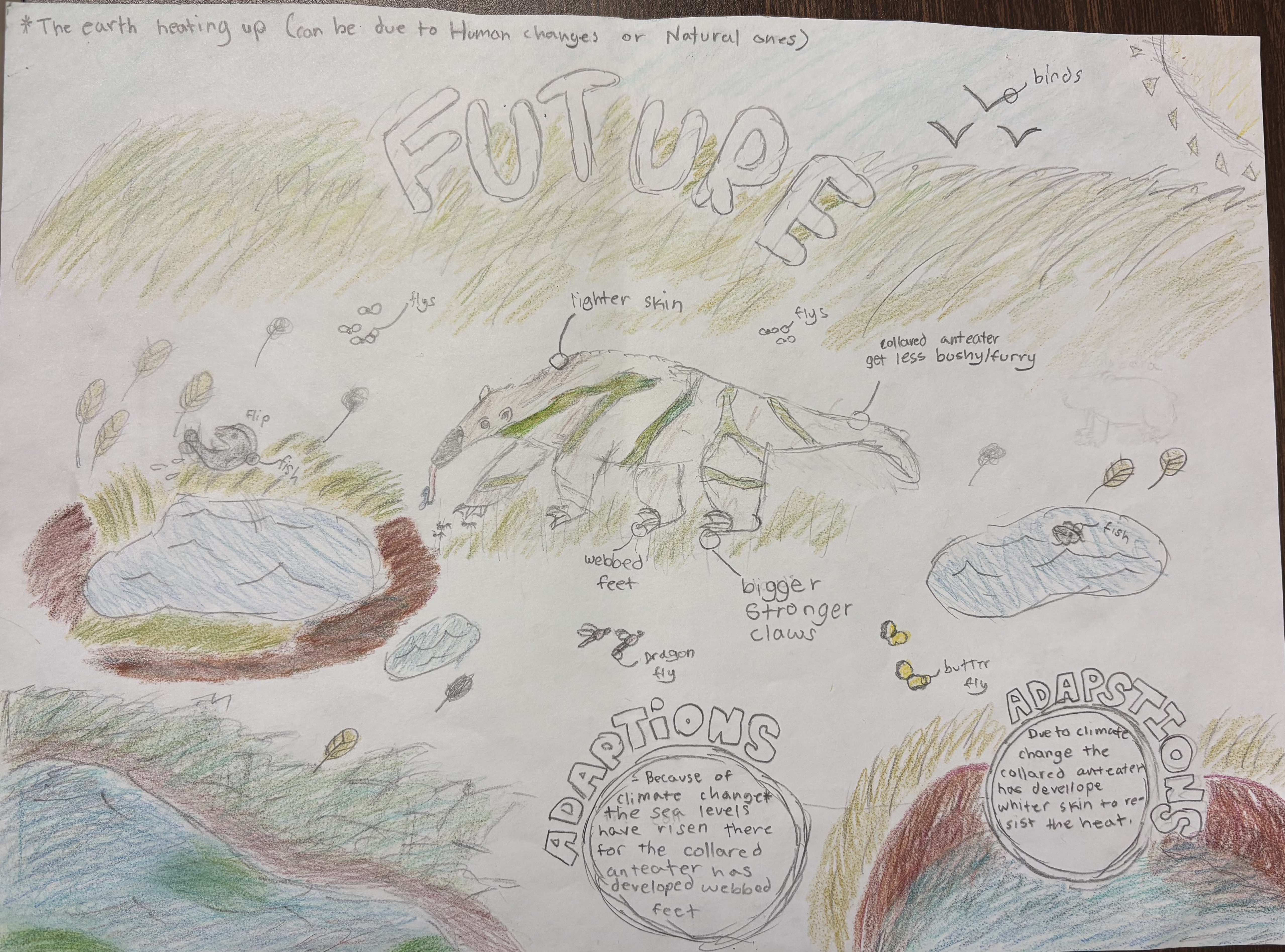 Climate change will cause glaciers to melt, and the sea level would rise, causing the collared ant eater’s home to become a wetland. The world will get much hotter so the collared anteater would develop a lighter furcoat because lighter fur is cooler. To help avoid predators it would develop camouflage, with light brown fur and rugged stripes of green. It would also develop stronger claws to fight back. Finally it would develop pseudo thumbs to help climb and grip things, to make finding homes easier, and to scavenge for bugs more.