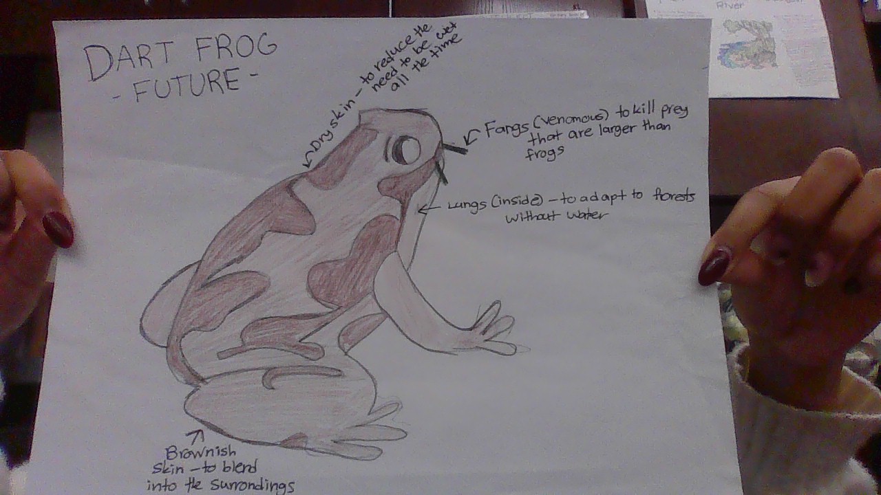Dart frogs are known for their bright coloration and toxic skin and they use these adaptations to deter predators and thrive in the humid rainforests of Central and South America. Their toxicity is derived from a diet of specific insects; their vibrant colors serve as a warning to potential threats. However, with climate change causing rising temperatures and reduced rainfall, the rainforests are expected to become drier and less suitable for the insects dart frogs rely on. This will likely decrease the availability of their toxic diet, making their current defense mechanism less effective. To survive, dart frogs may need to adapt by developing new camouflage patterns to blend into a drier, leaf-littered environment, rather than relying on warning colors. Additionally, they may evolve to tolerate a broader range of prey, enabling them to maintain some level of toxicity or develop alternative defenses to survive in a changing rainforest ecosystem.