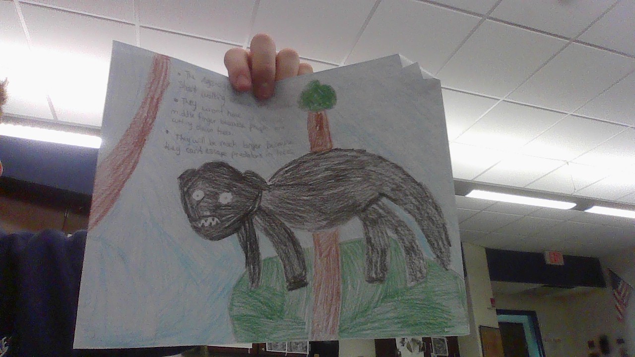 My animal is the Aye-aye and they live in the rain-forests of Madagascar. The Aye-aye has a unique extended middle finger adaptation that helps them grab grub. Aye-ayes are used to living in trees and are mostly found in canopy trees. They also have large eyes and dark fur for nocturnal life. Climate change is causing more droughts and people are cutting down the trees and the Aye-ayes will have no where to live. The animal will have to adjust to less trees and they will have to start crawling on the ground. Only the largest will survive in the wild so as generations pass then Aye-ayes will be much larger and they won't have the adaptation of the large middle finger because there won't be as many trees. Aye-ayes have incisors that can gnaw through wood and reach insect larvae in trees. They live in trees to evade predators.