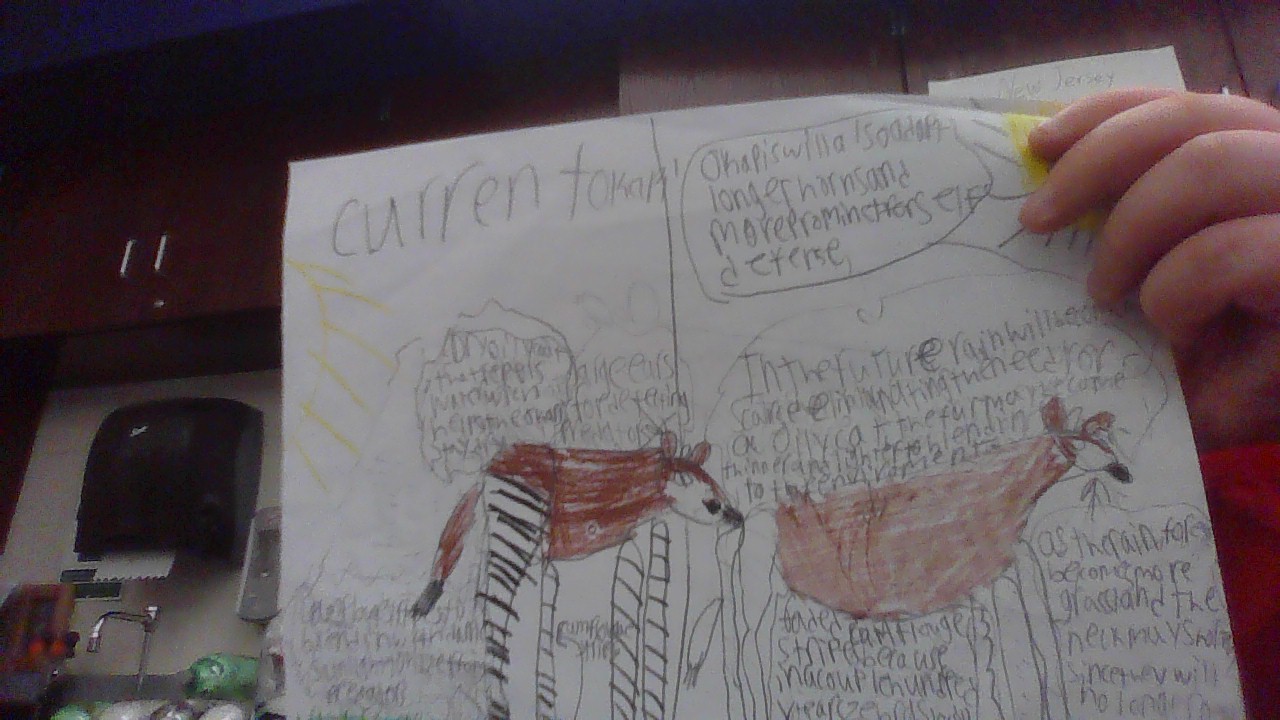 Okapis have many adaptations for survival, some being camouflage stripes, large ears for detecting predators, an oily coat for staying dry, and a long tongue for stripping leaves. Some of the adaptations are subject to change in the distant future due to climate change, one of which being the need for the Okapis oily coat. In the future, the climate may become more dry and rain will become scarce. The need for protection against rain will become secondary. Another adaptation that is subject to change is camouflage stripes. In a couple hundred years, Zebras may go extinct which would eliminate the need for the Okapais camouflage stripes. The Okapis will need to adapt to the new environment in order to survive. Another adaptation that may happen is the development of longer and stronger legs making it easier forOkapis to run and jump their way to scarce water in the future.