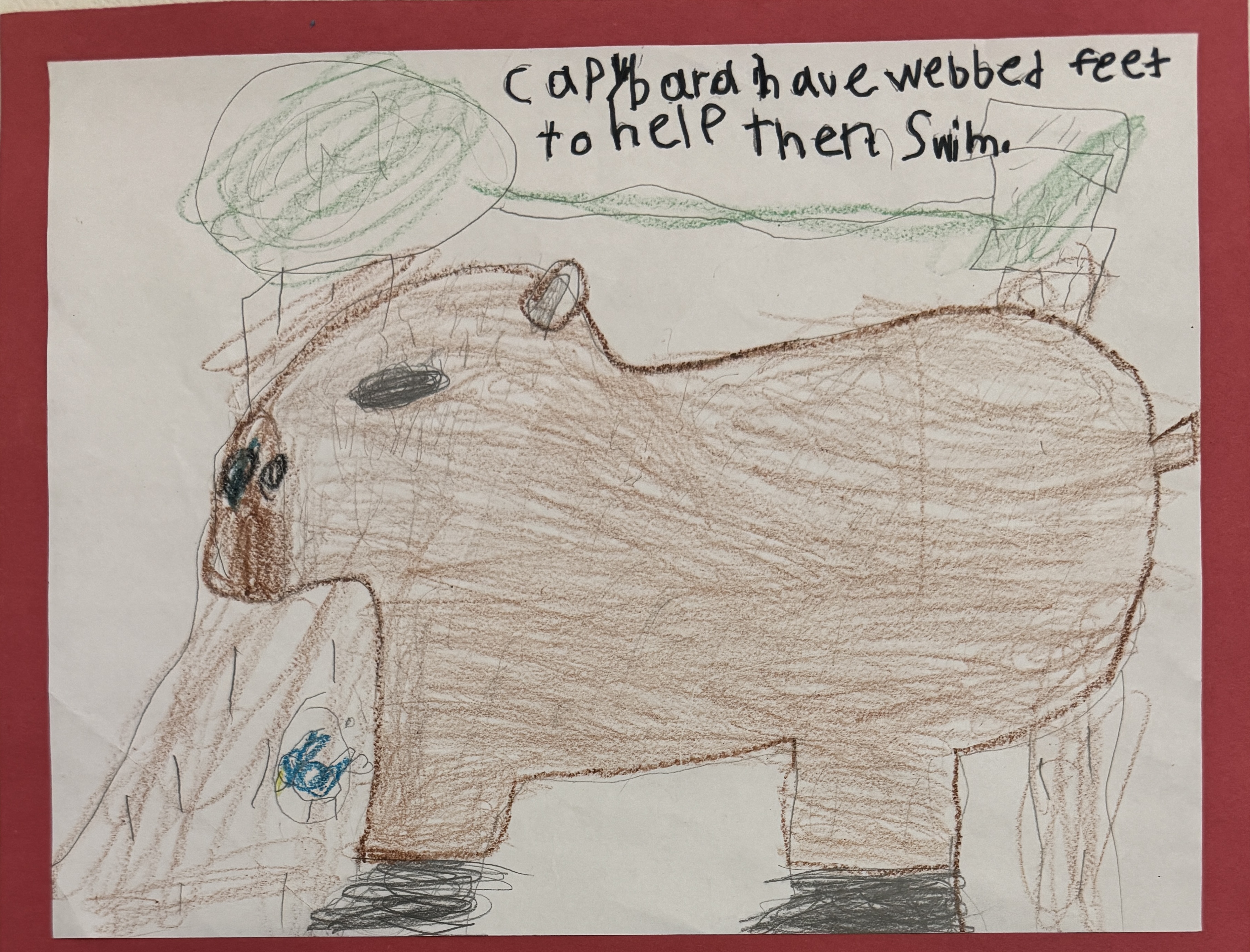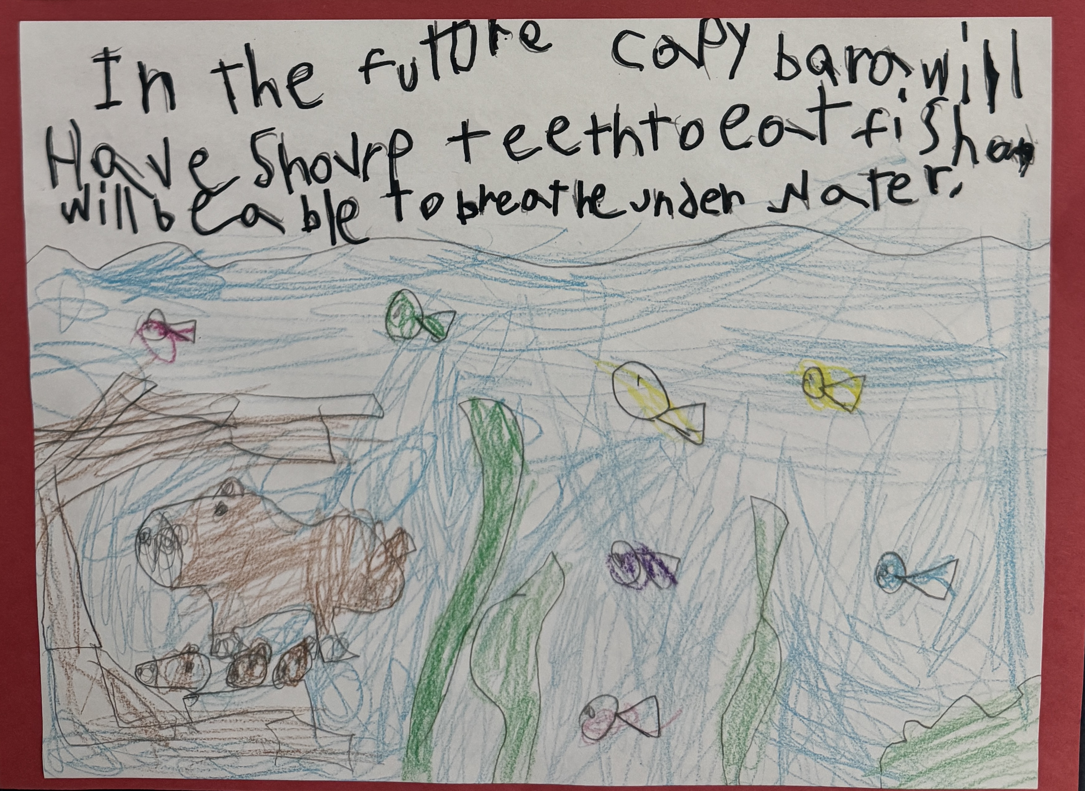 Capybara have webbed feet to help them swim. In the future they will live in the ocean. They will have sharp teeth to eat fish. They will be able to breathe underwater.