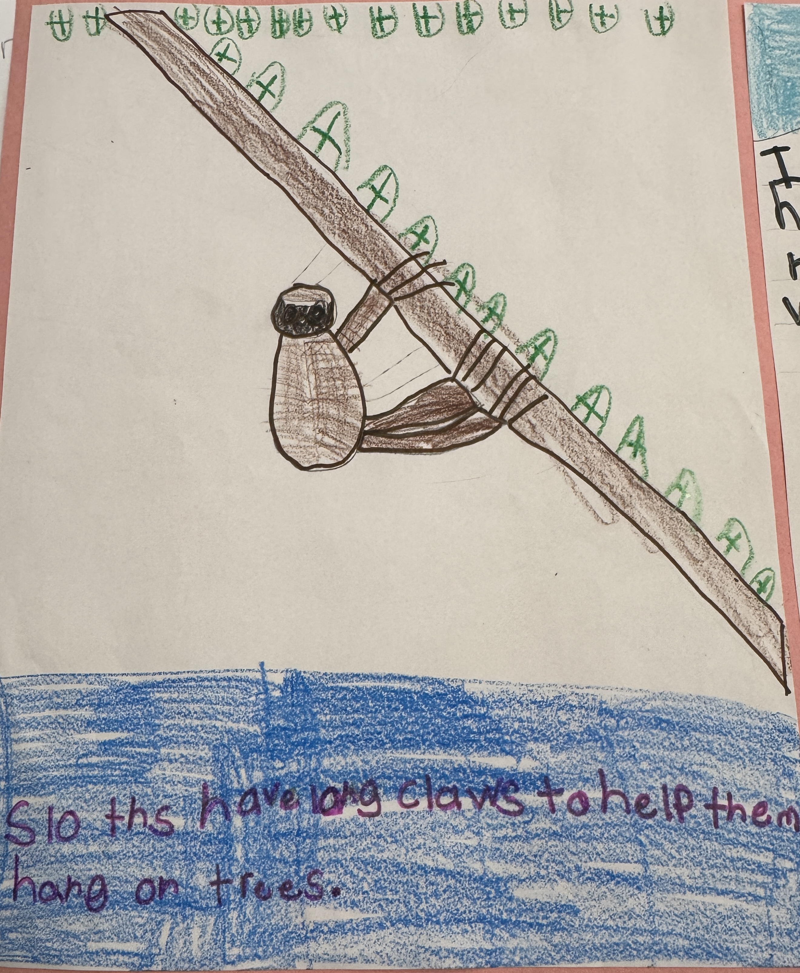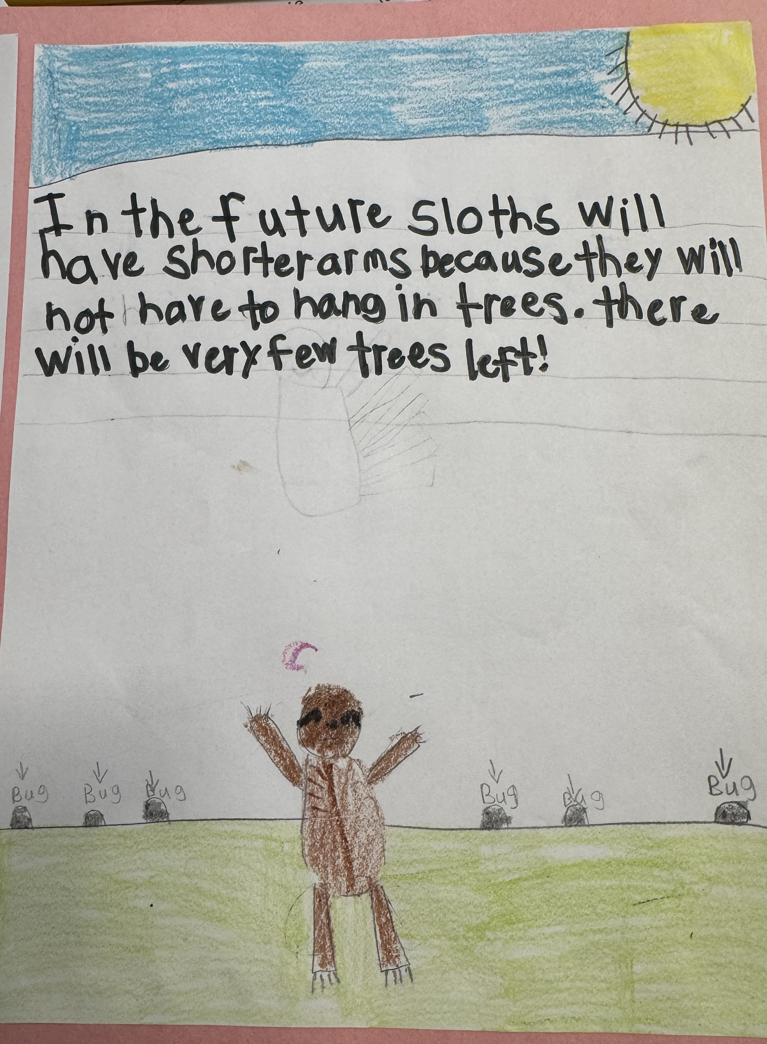 Sloths have long arms and sharp long claws to help them to hang in trees. In the future sloths will have shorter arms and shorter claws because there will be fewer trees. They will not have to hang in the trees. Sloths will eat bugs from the ground.