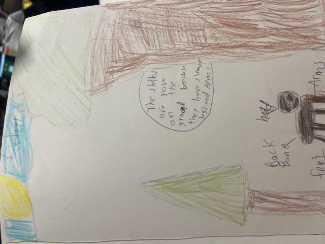 In the future they sloths will live in open water. They will develop sleek gray fur, webbed appendages for swimming, and the ability to move with significant speed. Living primarily on the ground and in water, their diet will shift to include chameleons and salamanders.