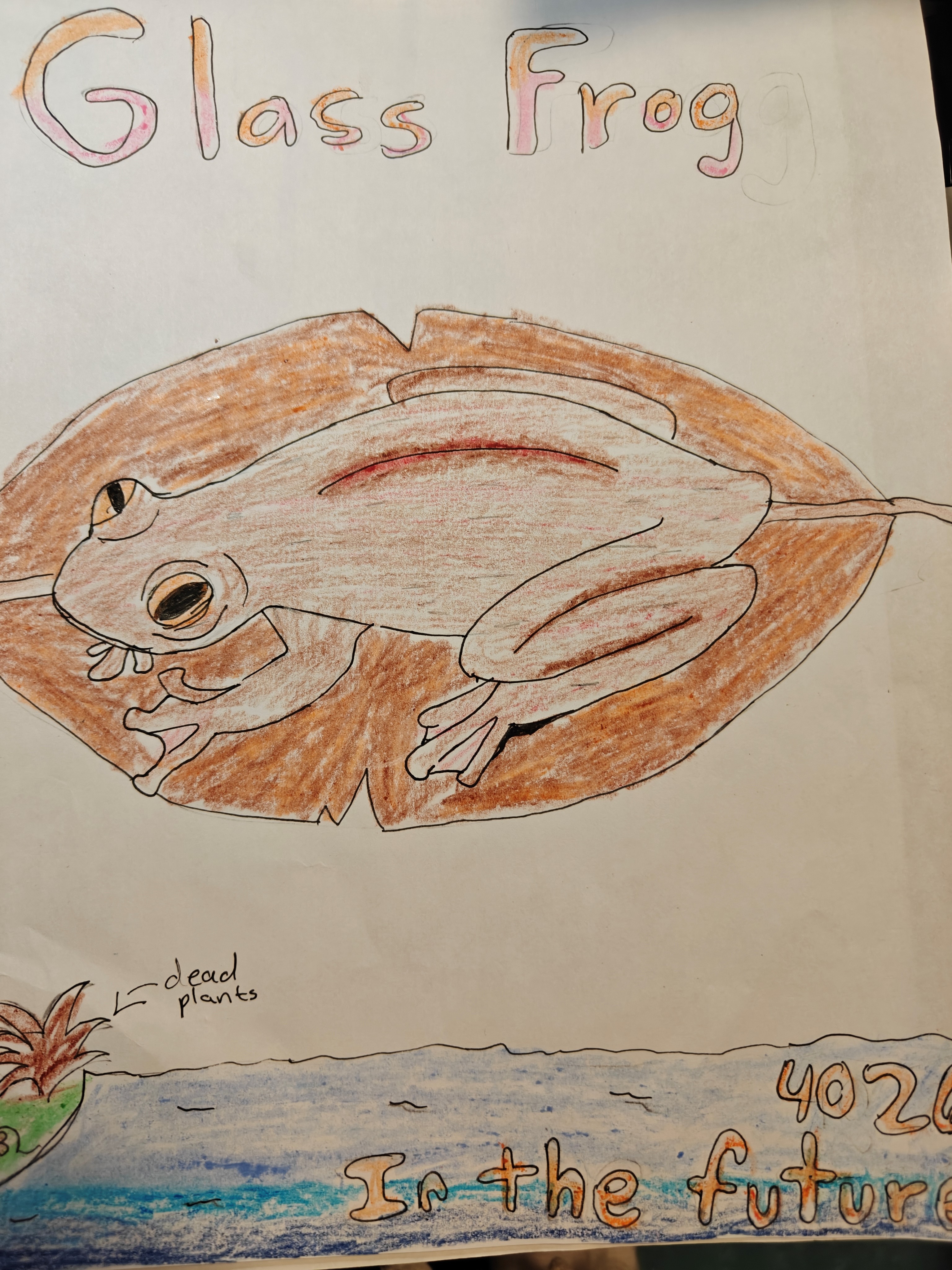 Global warming will increase in the future. I think the rainforests might become a savanna, as a result. There with dry dead plants and the water will decrease. I predict in the future it might have some fur because it needs to have moist skin all the time or they'll dry out and their color will be a brownish red color, because the dead plants.
