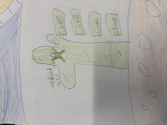 In the future the rainforest is gone. The rainforest turns into a desert. It is hot in the desert. The water is dried up. There are a lot of cacti. The desert dart frog changed color. The color of the desert dart frog becomes green. It helps the desert dart frog hide from predators. They still have poison to help them survive their enemies.