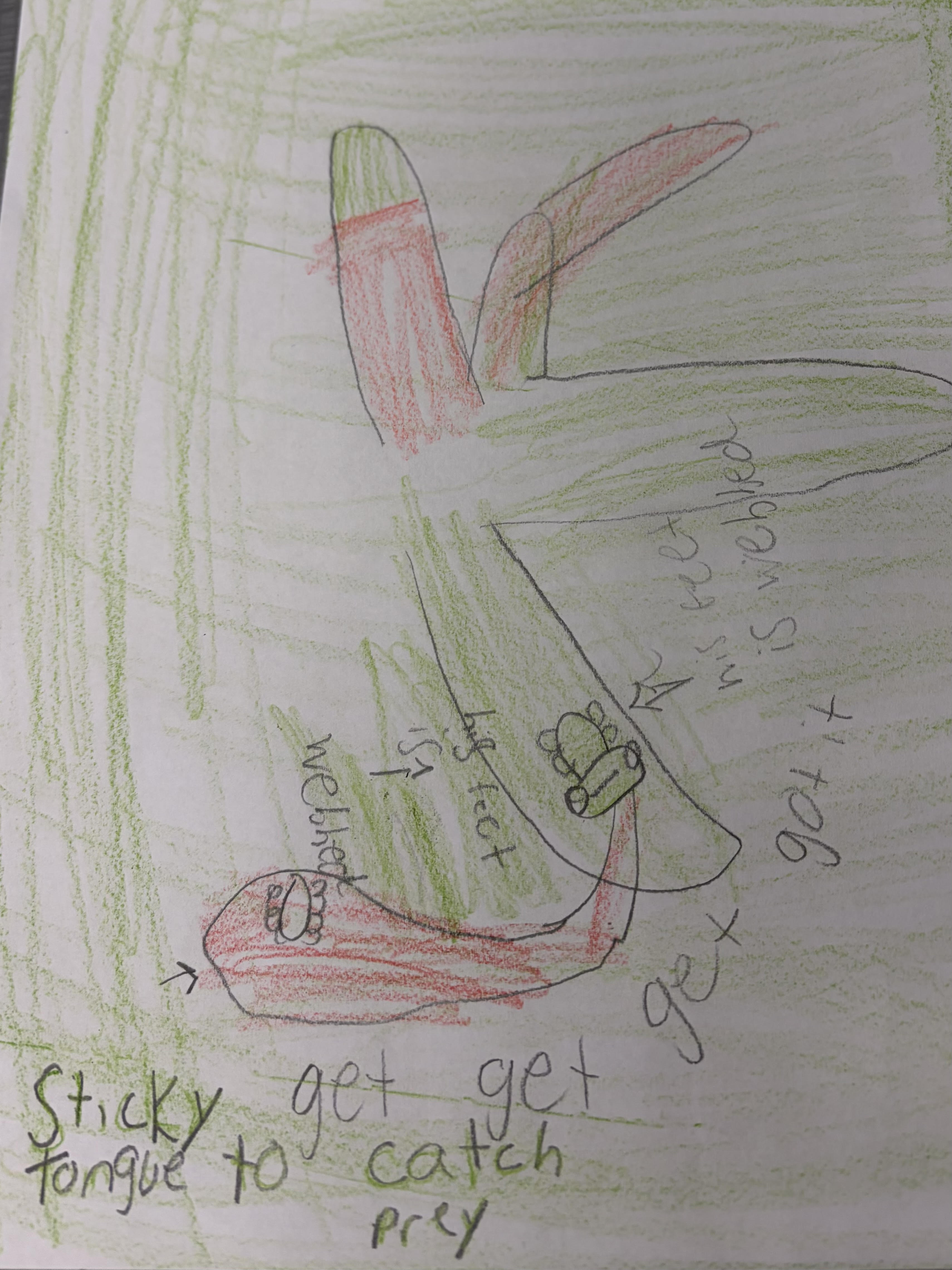 The poison dart frog lives in the rainforest. They eat insects like caterpillars and small ants. Poison Dart Frogs has webbed toes. The toes help them stick to trees in the rainforest. They have toxic glands that put poisons into their skin. This poison can kill anything that eats them. Their skin is bright colors that tell their enemies not to eat them.