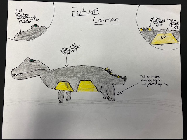 Caimans have gizzards and swallow rocks since they don't have molars but since small rocks are uncommon so I think they will adapt to have molars to chew meat and kill prey. I think they will adapt big lungs to run to catch prey. Lastly, they will adapt to having big lungs running on 4 legs to catch prey.