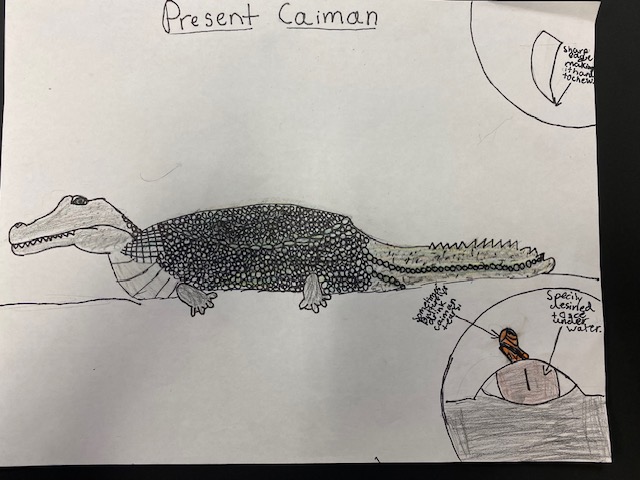 The tropical rainforest will turn into a savannah. The black caiman lives in the Amazon river basin. It has black scales for camouflage but in the savannah, there won't be black foliage, so they might adapt yellow scales to camouflage with the savannah. I think that caimans will be able to jump up on their legs killing prey, it will also provide a sneak attack when catching prey. I think that they will adapt to having a prehensile tail to keep their balance jumping up to catch prey.