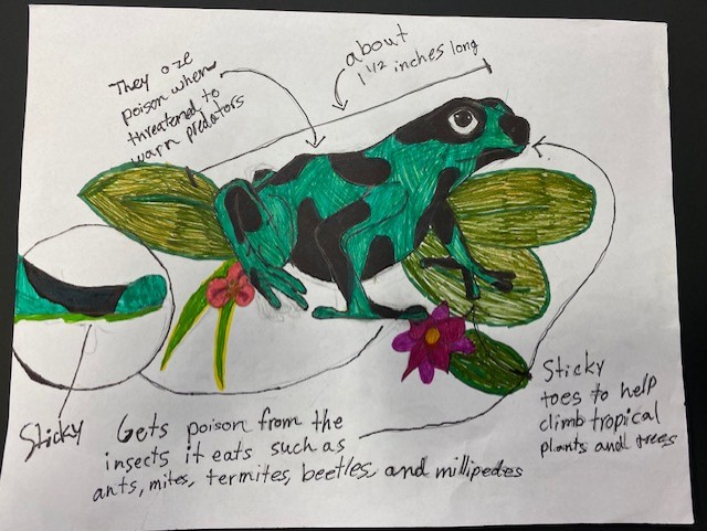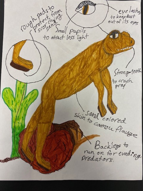 The poison dart frog lives on the floor of the rainforest. It’s diurnal. They’re caring parents for the mother lays unfertilized eggs for the tadpoles to eat. Both parents will carry each baby on their backs to safety. Their bright patterns warn predators that they’re poisonous. If the tropical rainforest dries up, resembling the desert, these changes will have to be made when the poison frog evolves. The poison dart frog’s diet will have to change, so it won’t get poison from the food that it eats and takes the poison from anymore. Rather than choosing violence, I think that it’ll sprint on its back legs which will grow sturdy instead of spindlier bones to evade predators. And outrun them by having bigger lungs to increase stamina. It will camouflage by being a sandy brown. It’ll lose stickiness in its toes and grow pads to protect it from scorching sand.