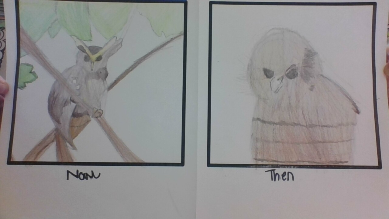 after 100'00 years, my rain forest animal has changed because it is different. the environment changed when the rain forest changed my animal looks different now. it has gray instead of brown, white, and tan. this helps the animal because it is strong. my animal also acts differently. it now eats fish. this change helps it survive by night vision