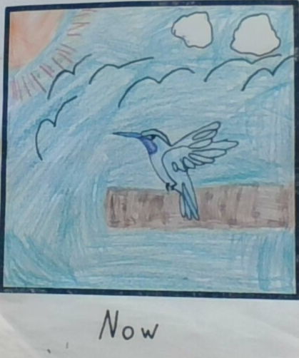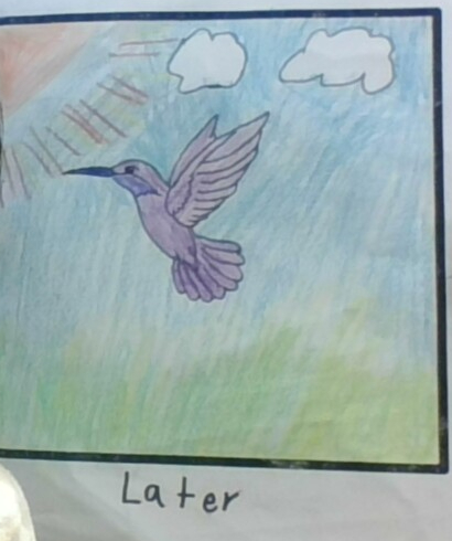 My animal is a hummingbird it likes to eat flower nectar for sugar, small insects and spiders. They live in the trees of the rain forest but after a forest fire there was no more trees left so the rain forest turned into a grassland and a lot of the animals died including insects so hummingbirds started eating berries because there was only berries left. They all turned purple because they only ate berries.