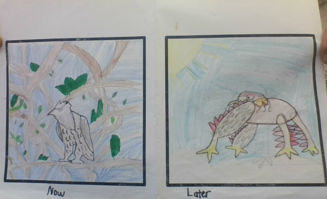 I think a harpy eagle will have wings below its head.They can move their wings back to how harpy eagles sit now.Before they fly they have to take a runway.The spikes,beak and talons are used to eat and hunt.I think the Amazon rain forest will change to a desert due to carbon dioxide and pollution.I learned that rainfall hasn't fallen for a while.That will cause to much heat.That will dry the skin of the harpy eagle.The skin will change to the color of the desert and cause it to camouflage.