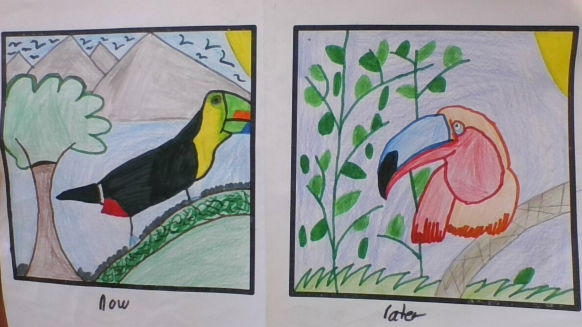 Toucan is a type of a bird that is around in nature. this bird can have different type of colors. like black yellow green. after 25,000 years my rain forest animal has changed because no it now it lives in the grasslands and the colors change to be like blue red and orange and it also has some black. these birds can have a lot of colors they can have maximum of seven colors. it can fly for A Thousand Miles and these birds can fly from one country to another and they are very special. this is why I think toucan will be surviving in your future.