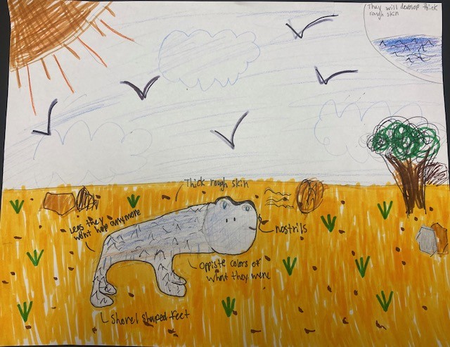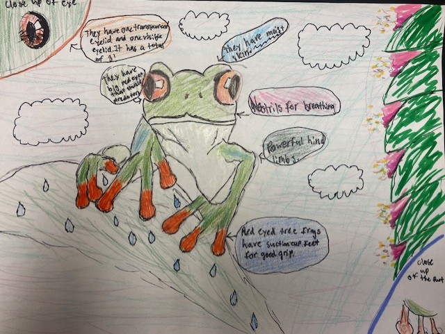 I think the rain forest will become a savanna with little water and the frogs will lose their moist skin and get thicker, rougher skin. They will develop shovel shaped feet to dig and escape the hot sun. They will also become toxic and purple instead. They will live on ground and because of the high temperatures, the red eyed tree frog will become strictly nocturnal to prevent dry skin and become more social to improve survival rate.