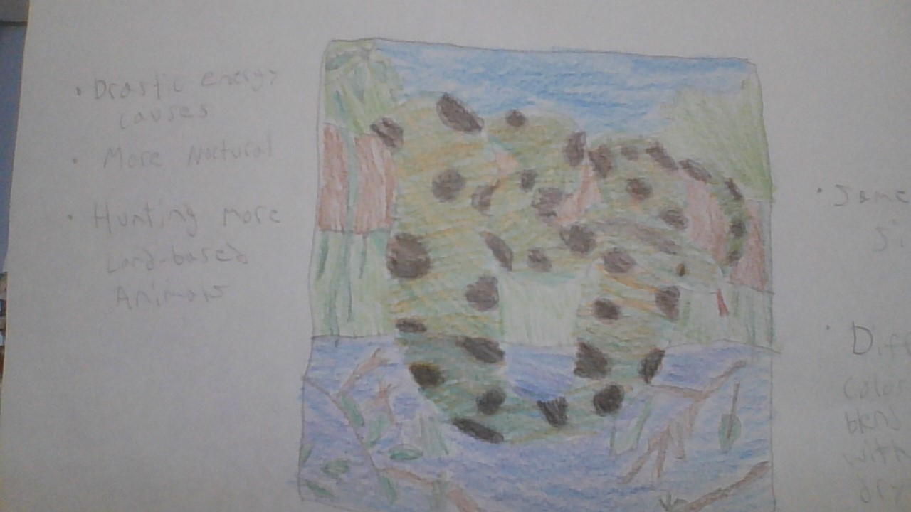 The Green Anaconda will most likely stay about the same size or gain a little bit of size. It will turn a different shade though, to blend in with the dryer spaces of the rain forest. The green Anaconda will also be more nocturnal so that they can hunt during the night and hide from the heat of the day. They will hunt more land-based animals too. They will also have more Drastic energy because of the heat from the sun.