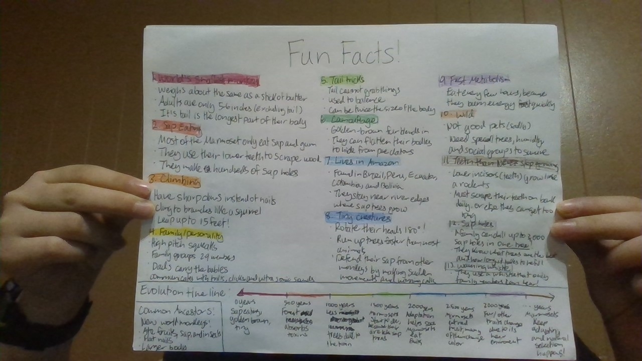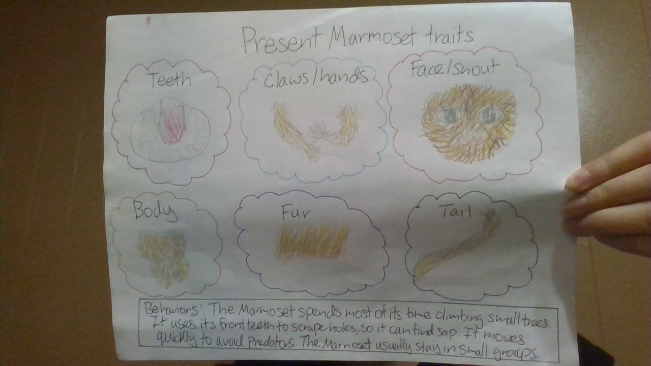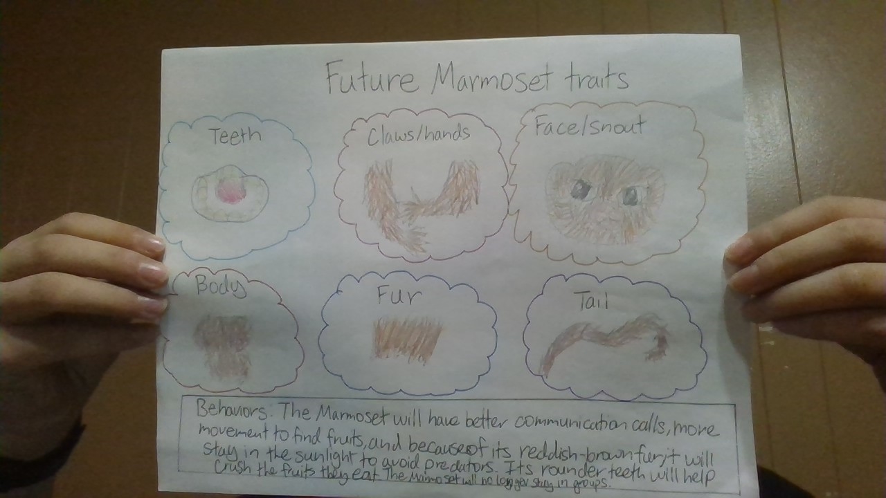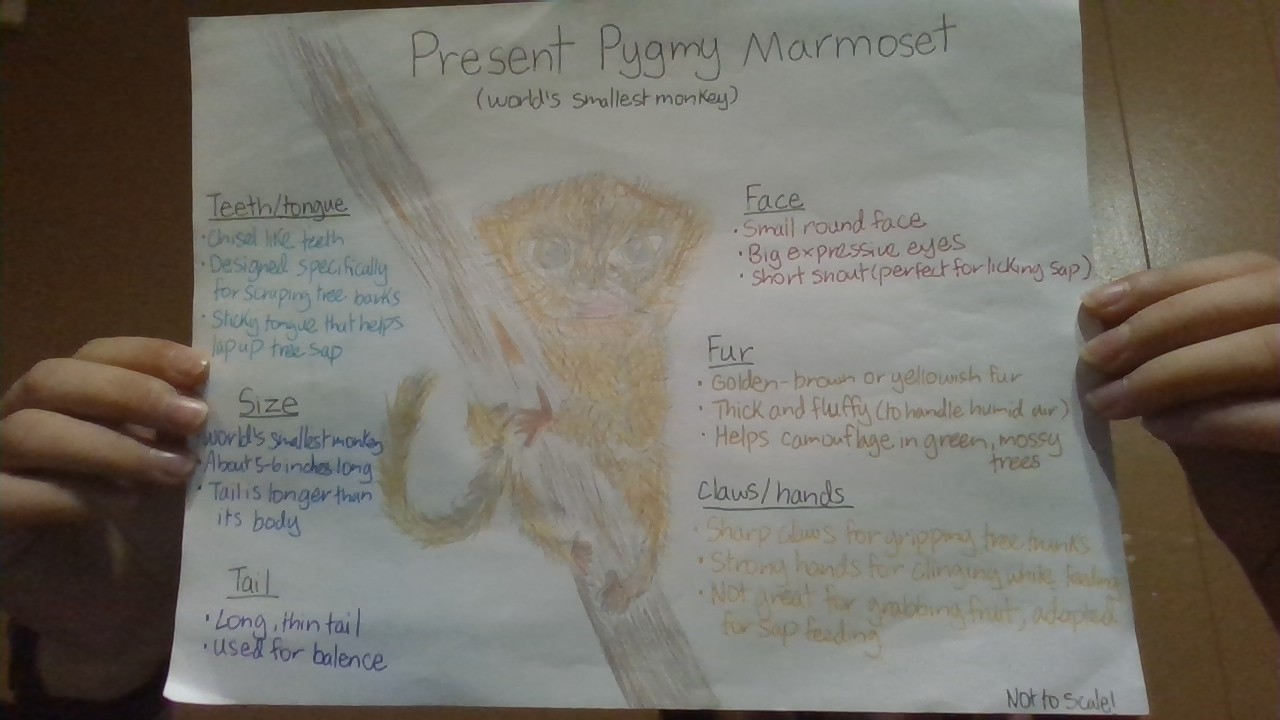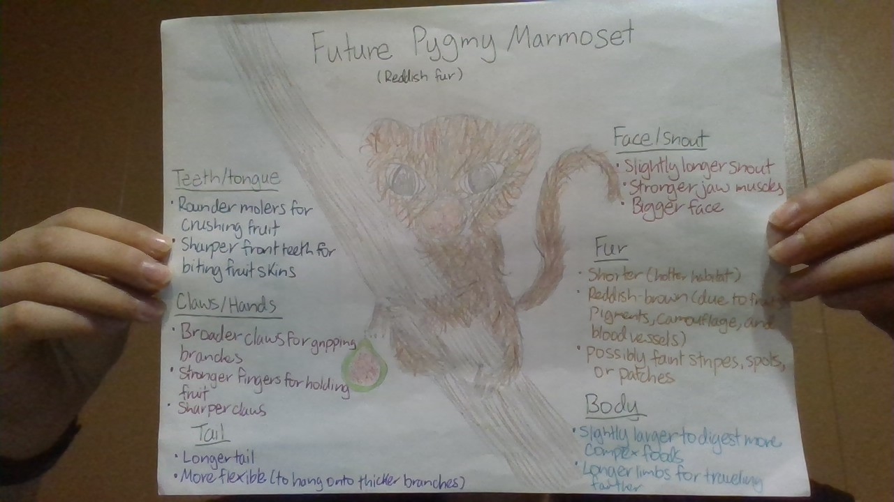 Pygmy Marmosets (the world's smallest monkey) depended on sap trees for food, scraping barks with their sharp teeth. As the sap trees disappeared, many marmosets died, but a few survived by switching to red fruits. Natural selection changed the Marmoset's traits. Their teeth became rounder for crushing fruits, their claws thickened for gripping branches, and pigments from fruits turned their fur reddish-brown. Today, the future marmoset thrives in a warmer, sunlit Amazon filled with fruit trees instead of sap trees.