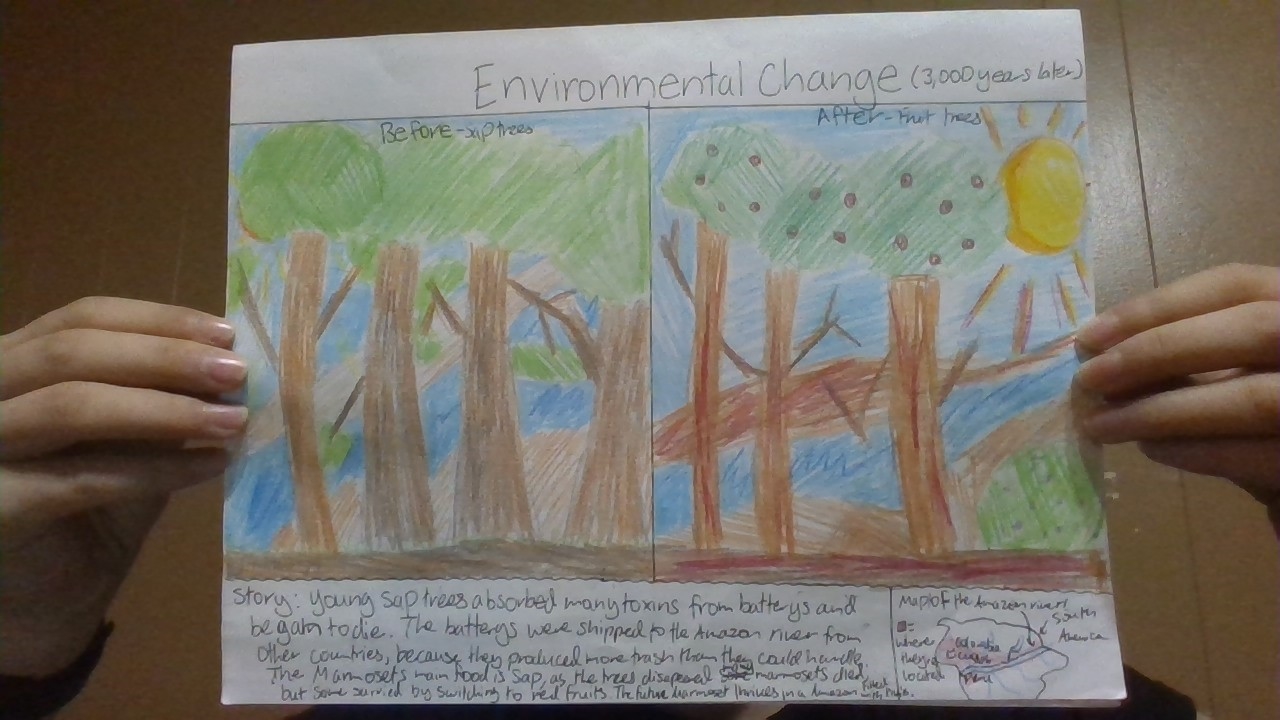 3,000 years from now, the Amazon rainforest will change in unexpected ways. Around the world, countries produced more trash than they could manage, and it was shipped to poorer countries along the Amazon River. Batteries and other wastes leaked acid, lead, mercury, and nickel into the soil and water. Young sap trees absorbed these toxins and began to die, while most fruit trees survived.