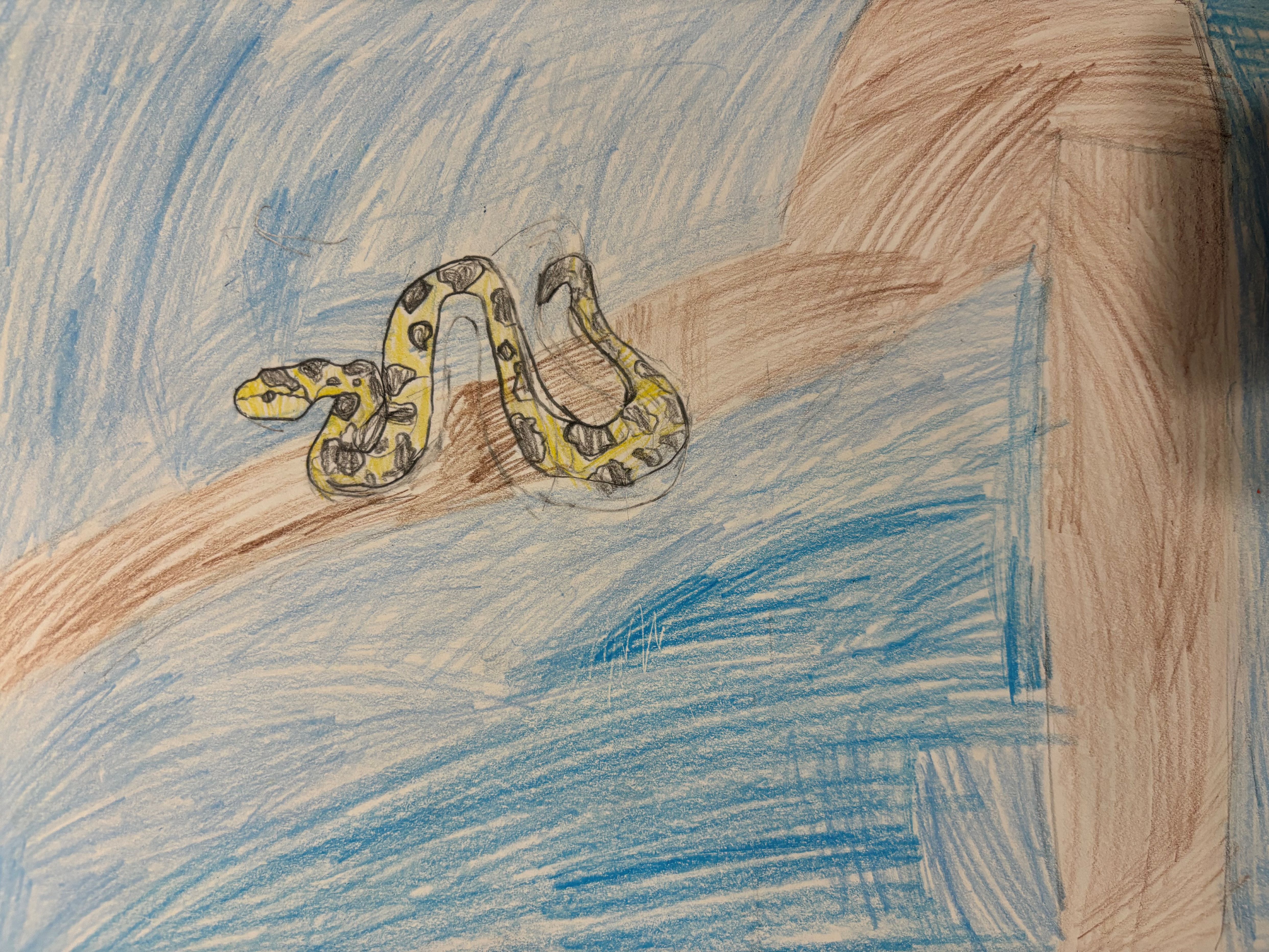 The Anaconda lives in the tropical Rainforest and swamps of South America. It is one of the biggest snakes in the world! They have eyes and nostrils on top of their head for underwater hunting. It swims very well and its strong muscular body helps it to squeeze animals like fish, birds, and deer for food. Thousands of years from now, the rainforest will change. Rising seas will turn the land into marshes and wetlands. The anaconda will need to change to survive. It will become smaller so it can move through thick plants. It will grow small fins and gills to help it swim and breathe underwater longer. Its skin changes colors to match grass and muddy water. It will eat new food like crabs and fish. It will grow sharp, special teeth to protect itself from predators.