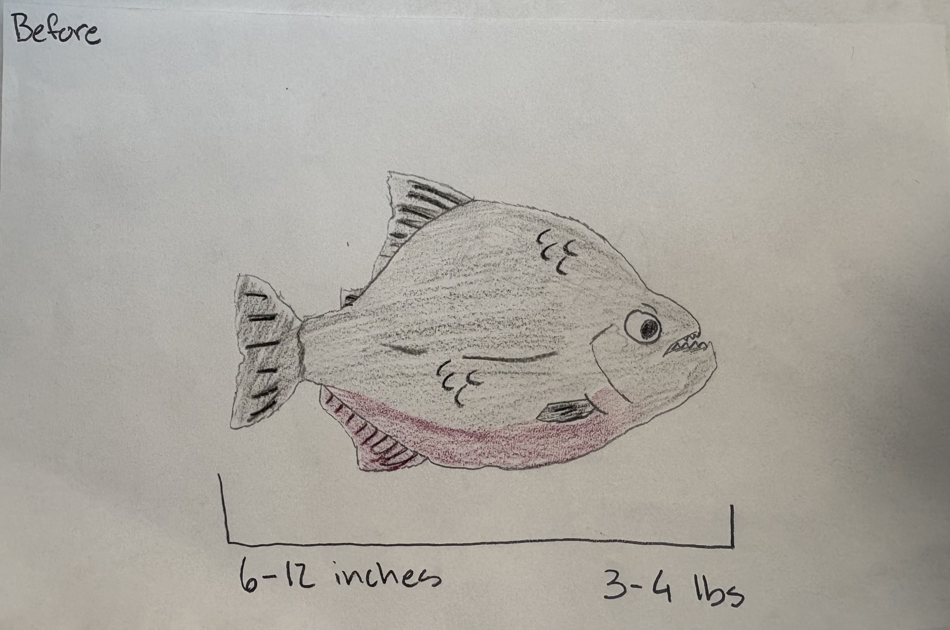 The red-bellied piranha is native to the Amazon River basin. They travel in schools throughout the low elevation sections. Having a red underside with a gray, rounded nose with razor sharp teeth, these physical adaptations will evolve while the rainforest drastically changes. Piranhas will become smaller with more of a greener camouflage and duller teeth to adapt to lower water levels and having more of an herbivore diet.