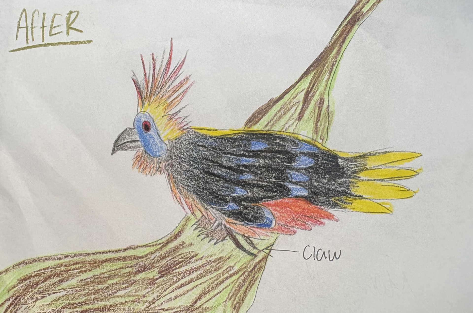 Hoatzins are chicken sized birds that live alongside rivers in the Amazon. They live in small social groups. They are clumsy fliers and have very bright colors. Young hoatzins have claws on their wings to help with climbing. In the distant future, I think hoatzins will become more aerodynamic as well as keep the claw on their wings through adulthood so that they can move easier through the forest. I also think they well develop more colors on their feathers.