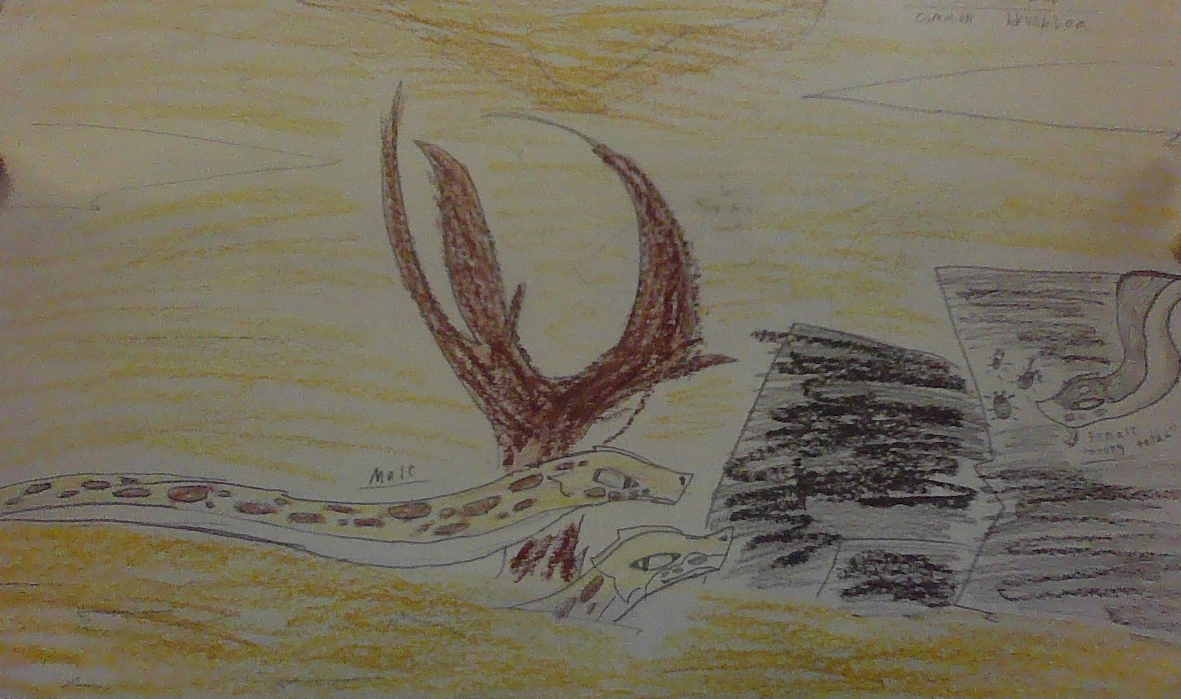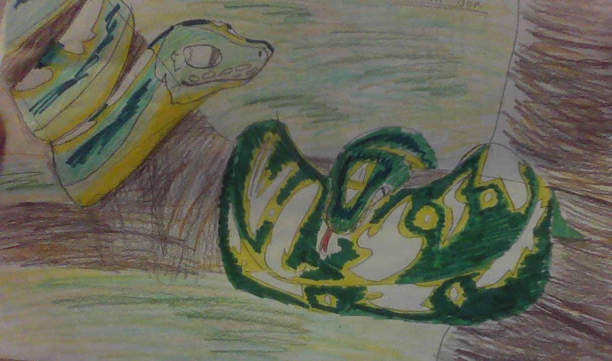 Since you probably know what Emerald Tree boas are, we can go about 3,000 years into the future. Environmental changes have turned the Amazon rainforest into a desert. There are, of course, not many trees in a desert, so Topaz Brushboas have changed to live in rocks and small caves. With no trees, there is not much prey in the desert, Topaz brushboas have also become smaller so they need less food, and less sensitive sensors to detect prey and not sand. Finally, since they’re in the desert with a lot of sand, their past green coloration only makes them more visible to predators. Males are yellow, brown and white, while females are grey and white.
