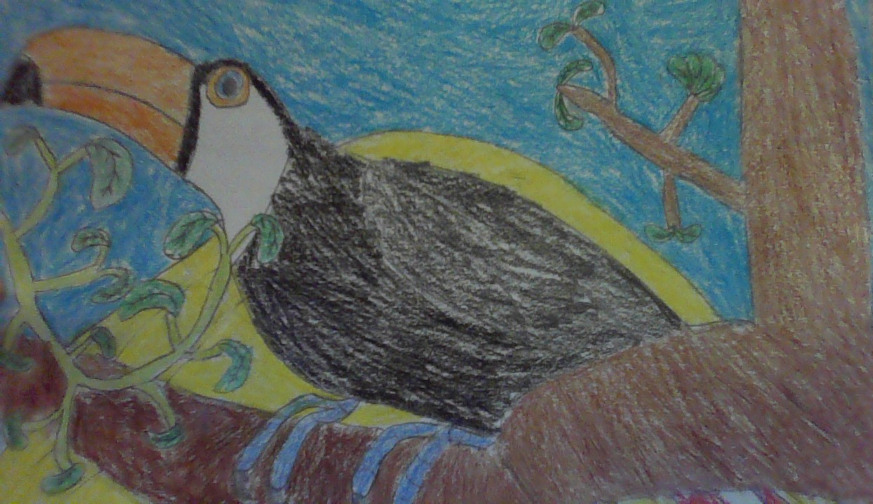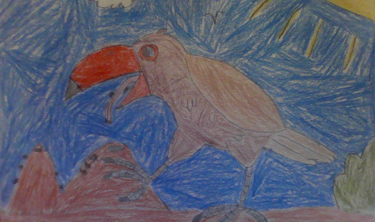 But 10000 years in the future things are different, the area got hot and most of the plants died. The toucan adapted since the environment changed so much, so now it eats insects and some plants. Its feathers have become a lighter color, and ruffled from digging small burrows. It got strong legs to run but that made it too heavy to fly. The toucan also got a long tongue to eat easier.