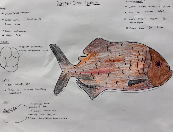 Piranhas are herbivores. they thrive in shallow, warm, FRESH water. I changed the piranha to be an ocean dwelling creature. An ocean adapted piranha would have to develop larger kidneys to produce highly concentrated urine and conserve water in a salty environment. Its body would become smaller and more streamlined for faster swimming, while dull browns and blacks would help it blend into rocky sea floors. Enlarged gills with extra chloride cells would regulate salt and improve oxygen intake. Its enlarged eyes and stronger jaw would help make it an efficient hunter in a more competitive environment.