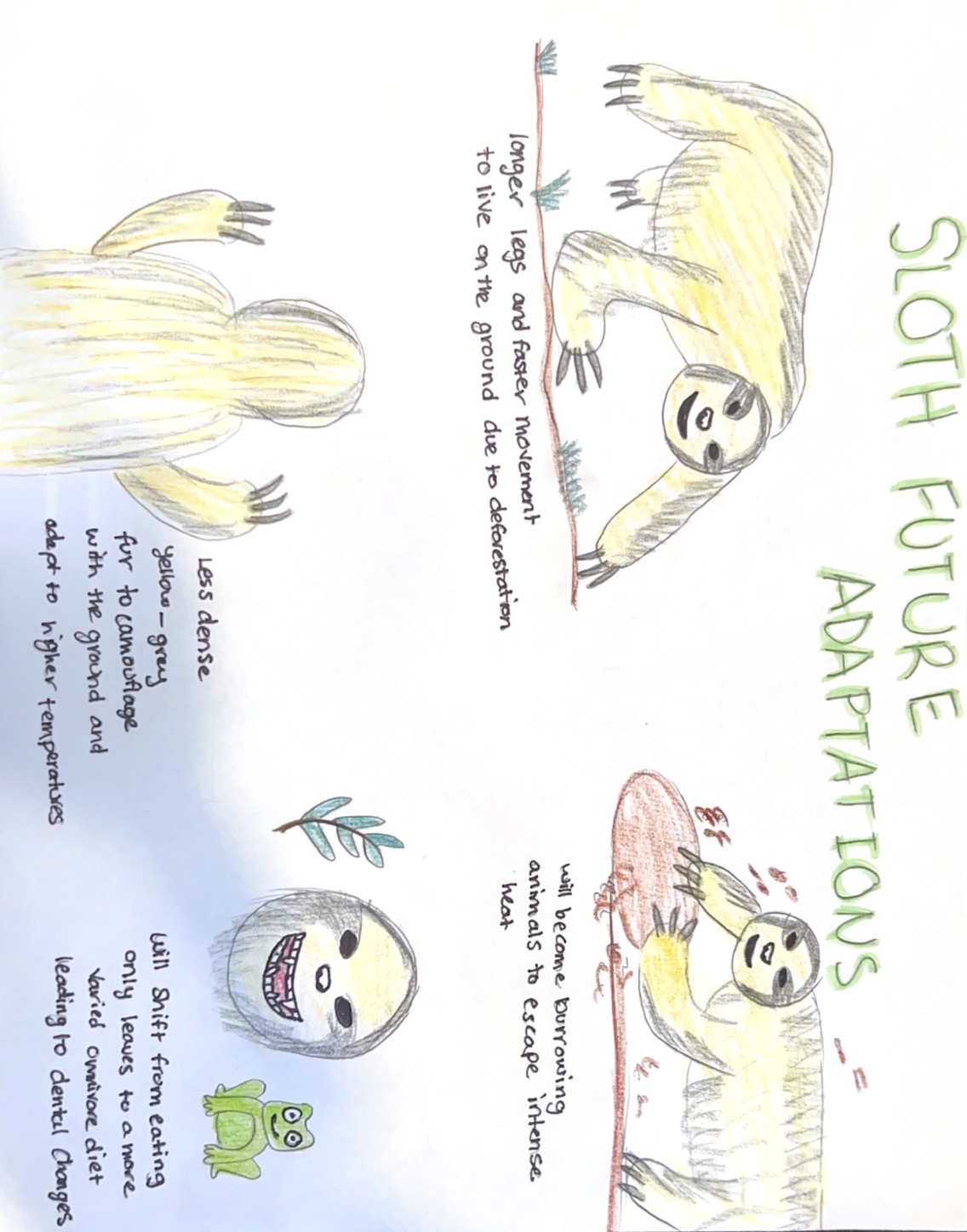 Three-toed sloths inhabit the canopy of tropical rainforests across the world. Sloths have adaptations that help them thrive in their environment. For example, they have specialized claws for hanging in trees and organs that are attached to their ribs to help them breathe while upside down. They exhibit behavioral slowness and limited defecation for protection and reduced exposure to ground predators. Their fur houses algae to provide them with green camouflage to blend in with the leaves. In the future as rainforests turn to savannahs, global warming increases temperature, and deforestation ruins habitats, sloths will have to adapt. They will develop longer legs and faster movement to live on the ground. They will have less dense, yellow-grey fur to camouflage with the ground and adapt to higher temperatures. They will become burrowers to escape intense heat and will shift from eating leaves to a varied omnivore diet causing dental changes.