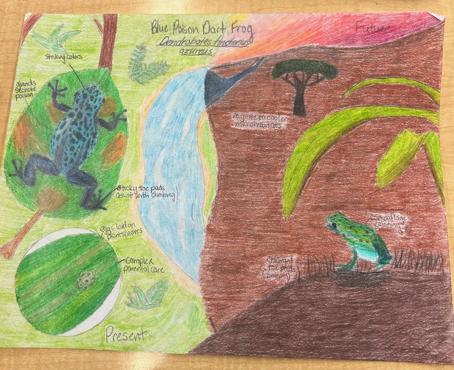 The poison dart frogs are a diurnal, ground-dwelling group of species who are found in tropical rainforests. They produce poison out of glands in their skin and have bright colors to warn off predators. There’s a noticeable lack of webbing and small, sticky toe pads to assist with mobility in their adult stage. In the future with climate change: increased temperatures and deforestation, this species may struggle to evolve sufficiently. Most likely, they will shift to cooler locations within their habitat and adapt to become nocturnal. Their sticky toe pads will enlarge to be better suited for climbing. Certain changes such as increased moisture-retention would be beneficial in a drier habitat to conserve water, along with slow change of phenotypic color to better match a more arid savanna ecosystem as a way of camouflage.
