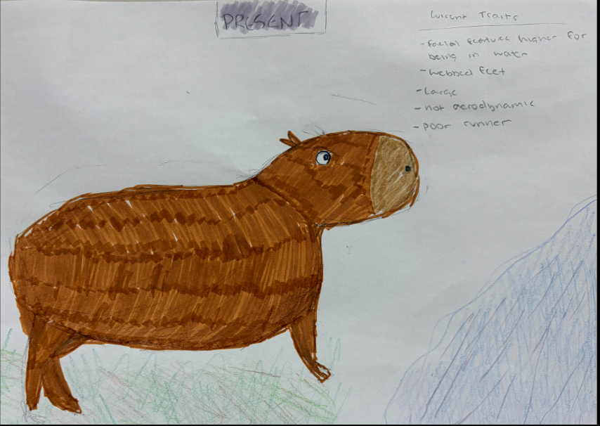 Right now the Amazon Rain Forest is green and full of water but that soon will change. How will this dramatic transformation affect the creatures living inside? Presently the cabybara is built for a semi-aquatic life, its toes are webbed and its facial features are high on its head for optimal comfort when floating. In the future the Amazon will be dry and barren. The capybara will lose its webbed feet and its body will change to be more suited for running. The capybaras new life will be full of danger so it must change colors to blend in with the barren landscape. All of these transformations are in its future unless something changes.