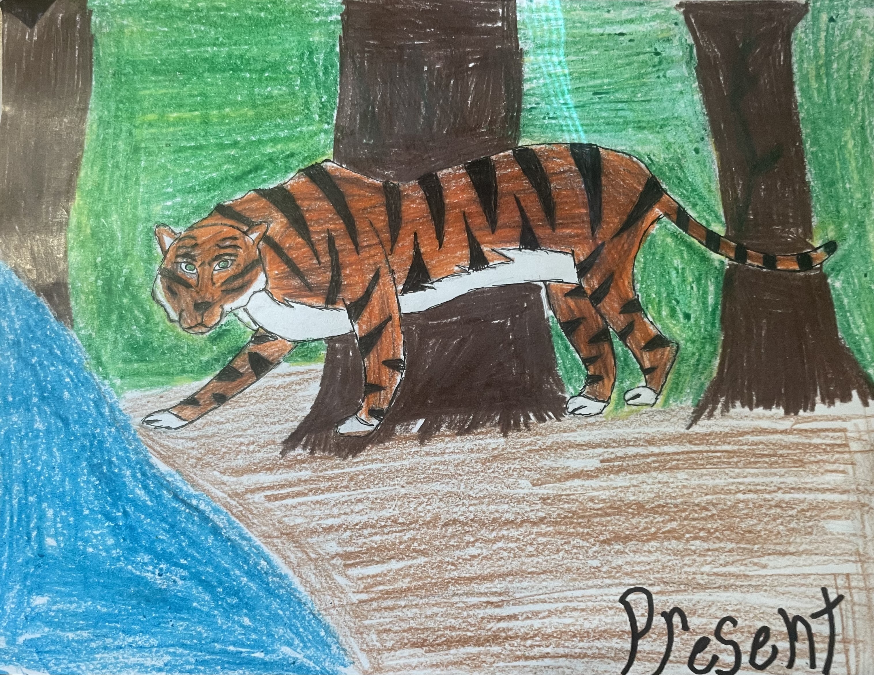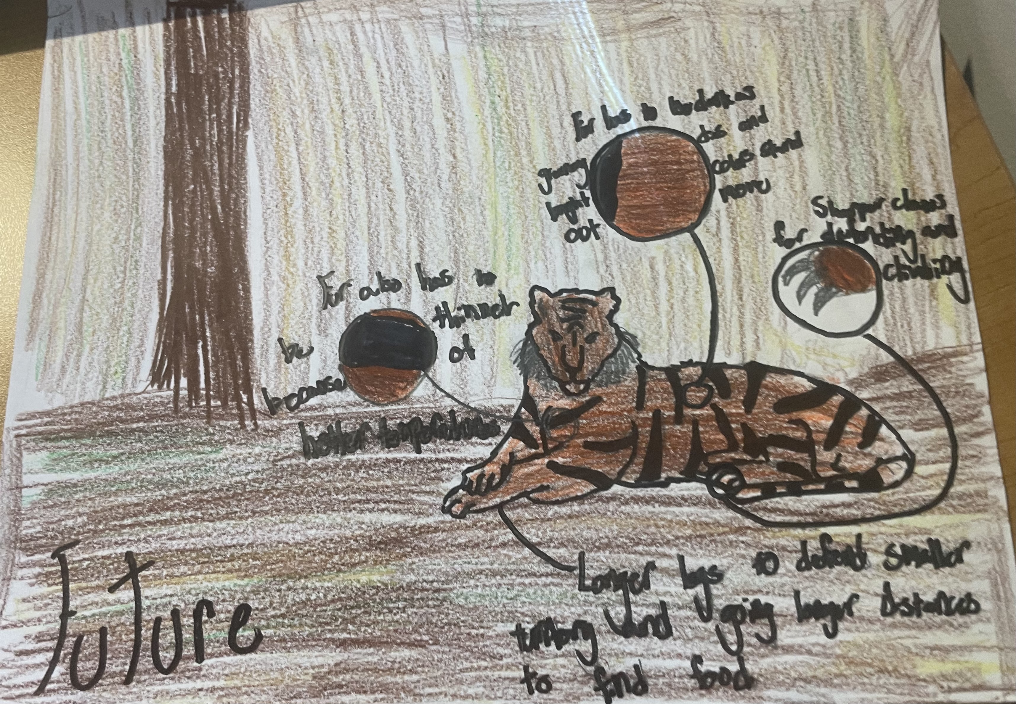 The animal that I drew was a bengal tiger. As you can see in the first drawing, the tiger is very colorful with orange fur, a river, and a lot of greenery. But in the second drawing, all the colors have dulled down due to climate change. The forest started dying and drying up so the tigers fur had to become a darker shade of brown. The fur also became thinner due to the heat increasing. The legs and claws are longer due to the tiger having to traveling longer distances, and the claws need to be used for climbing and still killing animals when there are some. Since a lot of the water had dried up the tiger also had to have more capacity to store water. That is all, thank you!