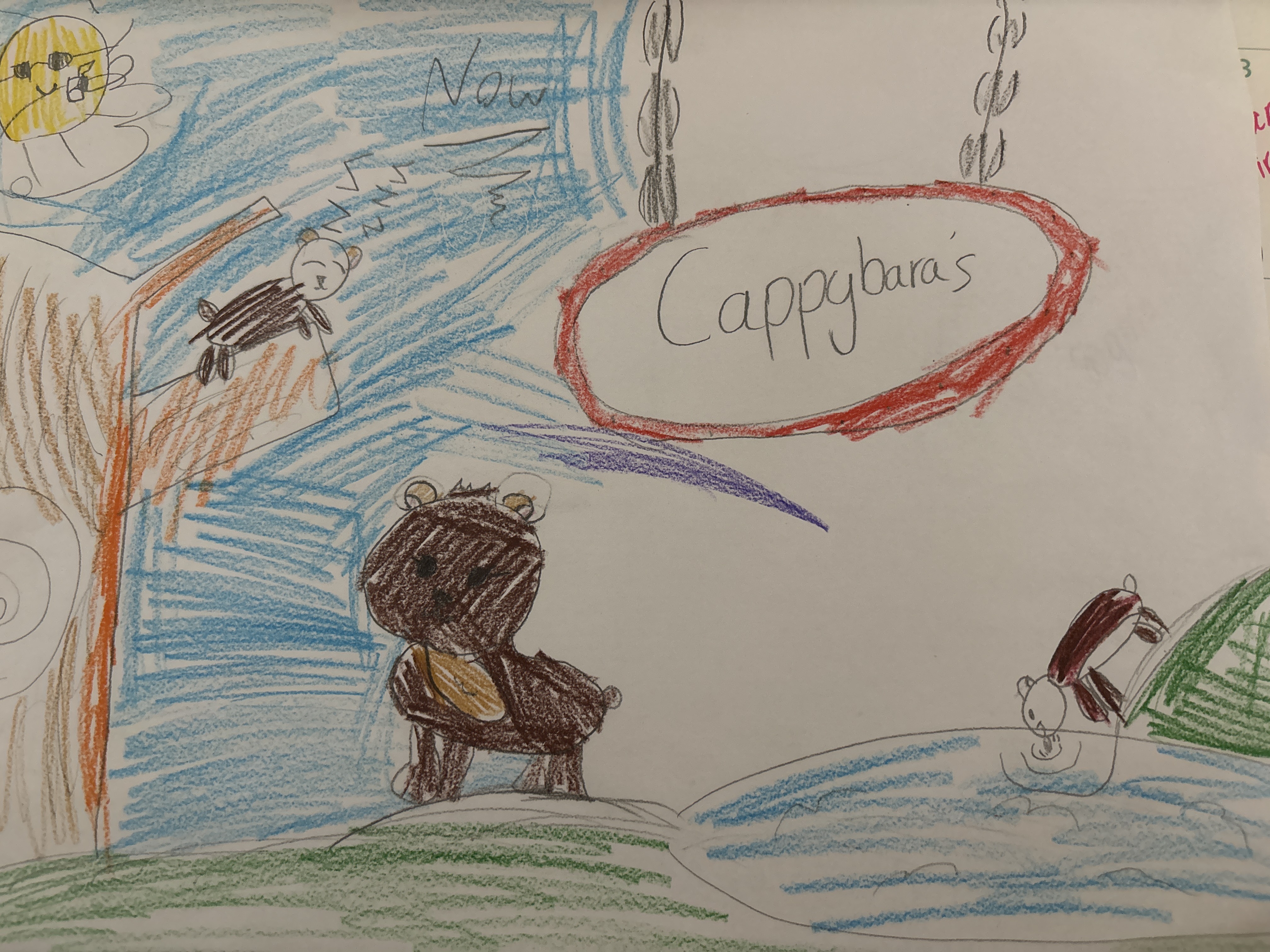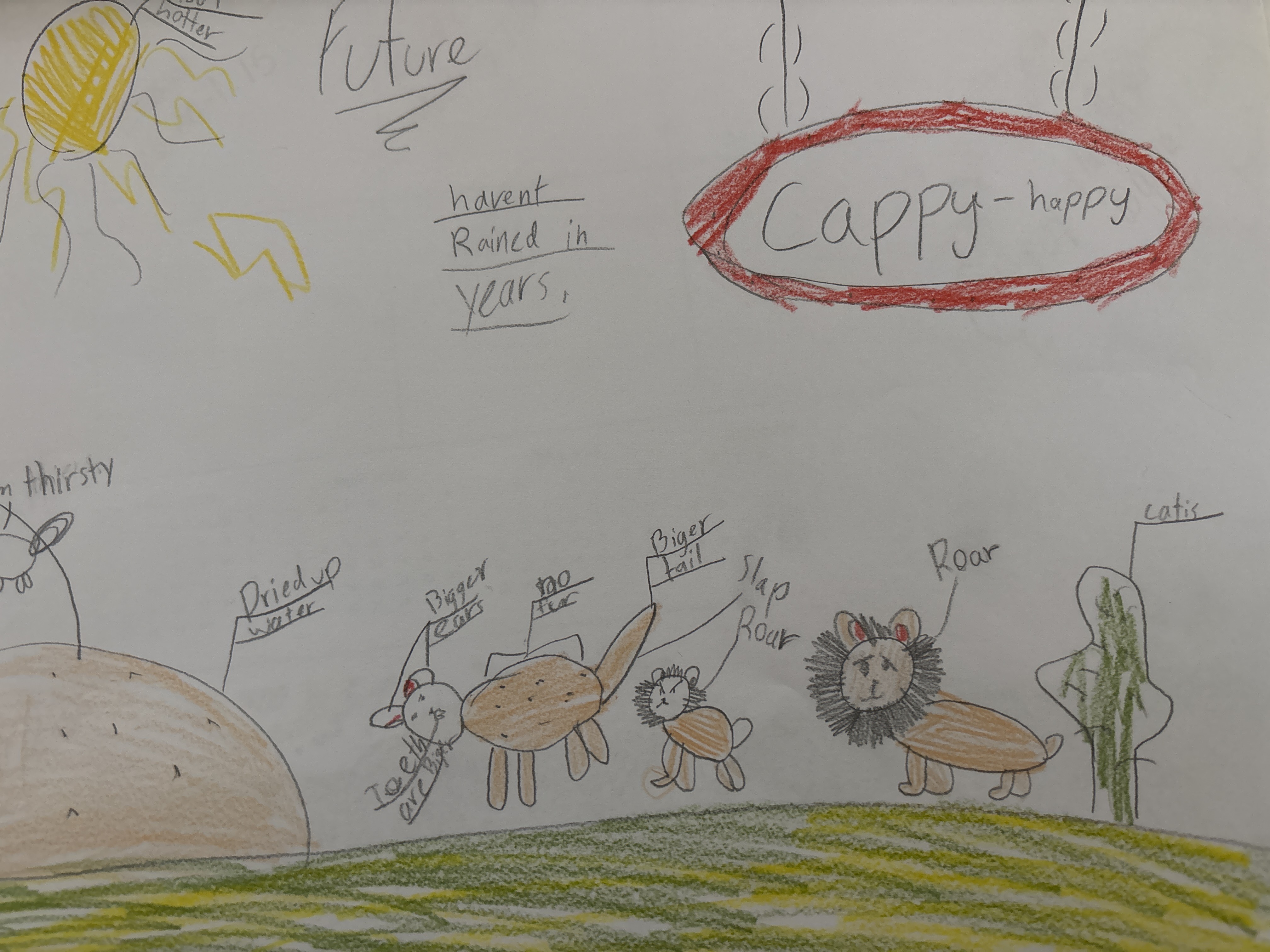My future animal's name is CAPY-HAPPY! Capy-happy went from living in the rain-forest to the desert. Their ears are bigger so they have a better chance of hearing if predators are near. Their body is hairless because they no longer have access to water like fresh lake water. Their tails grow longer to defend themselves from predators. Their webbed feet dry up. They eat ants from the dirt under-ground and plants like cactus. Now they look like skin-color animals with longer tails and have no hair at all. They have bigger mouths to eat bigger prey, or more than one at a time.