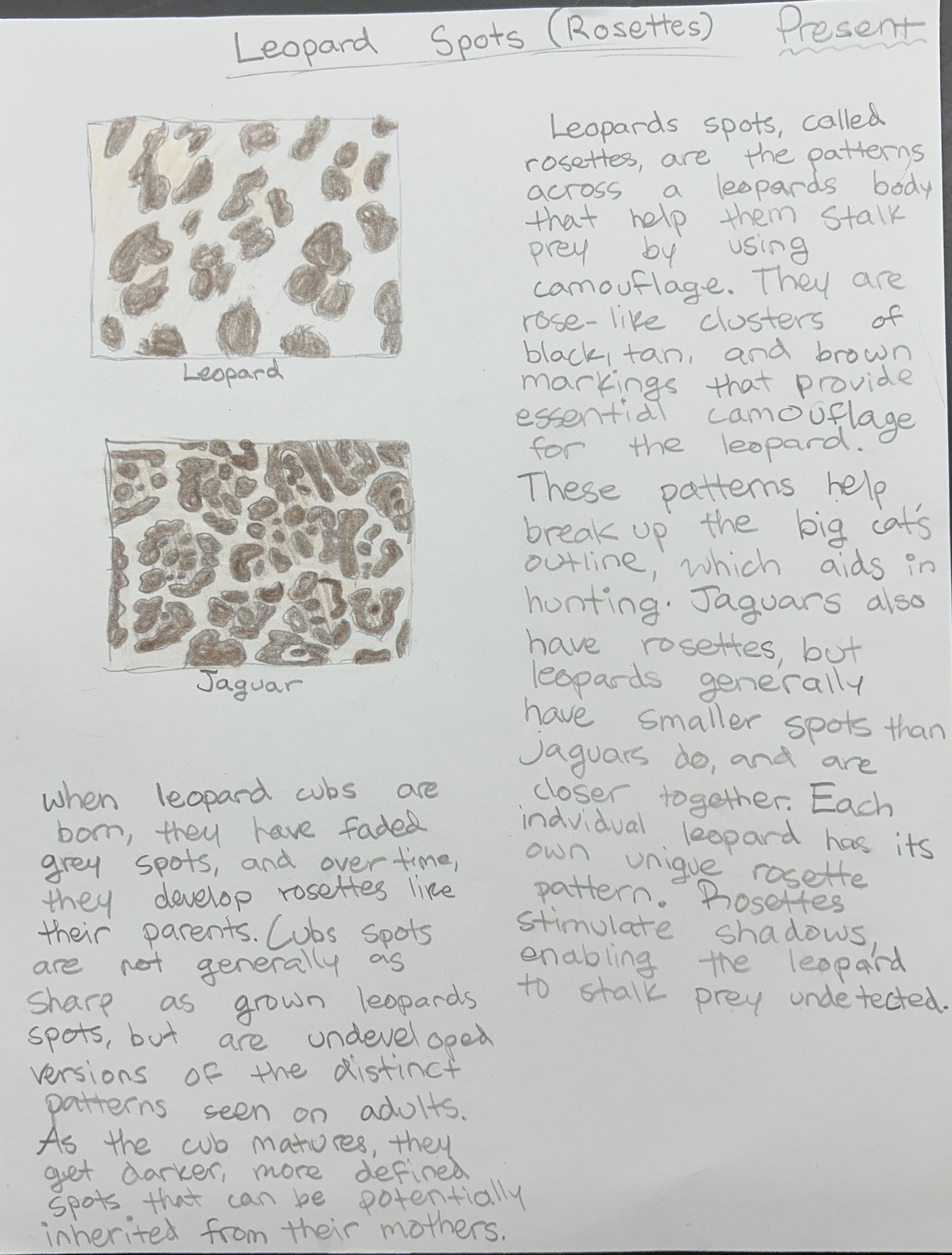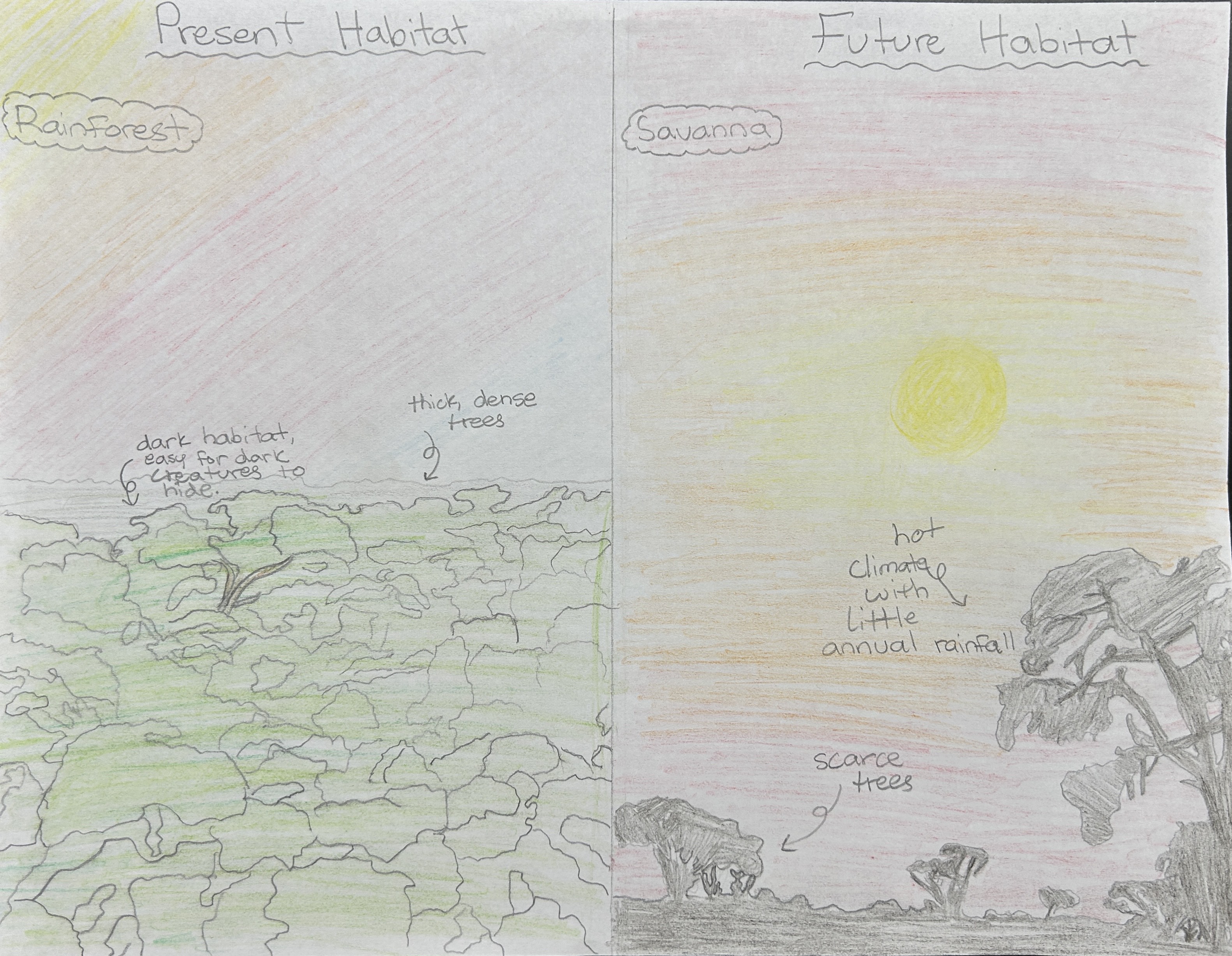 The leopard, otherwise established as the panthera pardus, is a big, powerful, solitary cat that is known for its rosettes or spots. The present leopard's current habitat is in the tropical rainforest, where it has dark fur tones to help it blend into the dark, dense forest. Rainforest leopards are typically quite big and muscular since they are apex predators in their environment. The future leopard's habitat will be the savanna. Savanna leopards are typically smaller and more agile, and have bigger ears that help take in cool air. They also are more migratory, due to the seasonal rainfall.