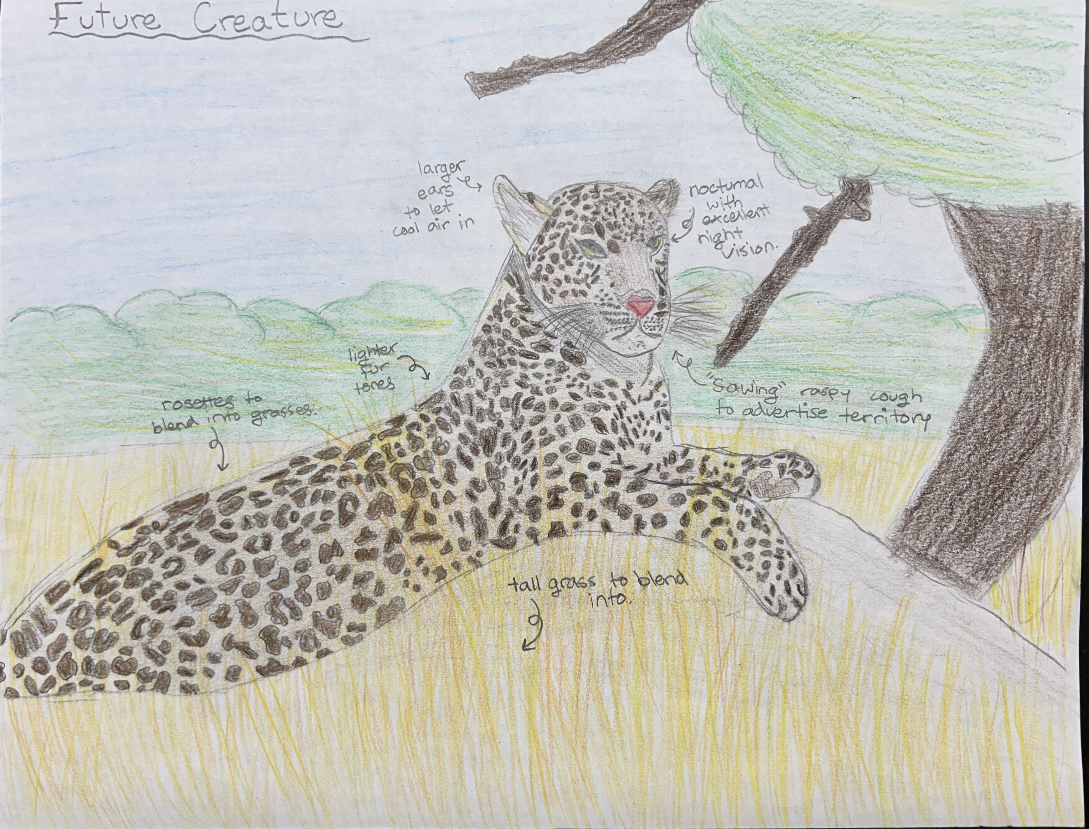 I think that the rainforest will change to the savanna by becoming hotter with less annual rainfall, and that there will be a lessened amount of trees. The adaptations that leopards will gain are bigger ears, a more agile body, lighter fur tones, and becoming migratory to find water or rain.