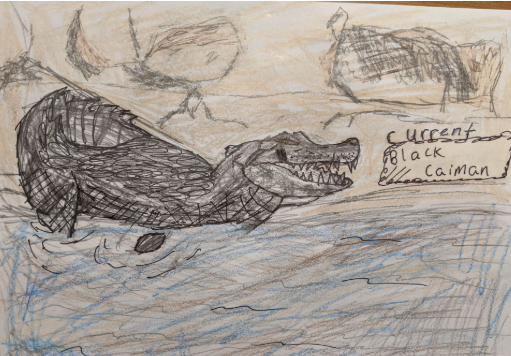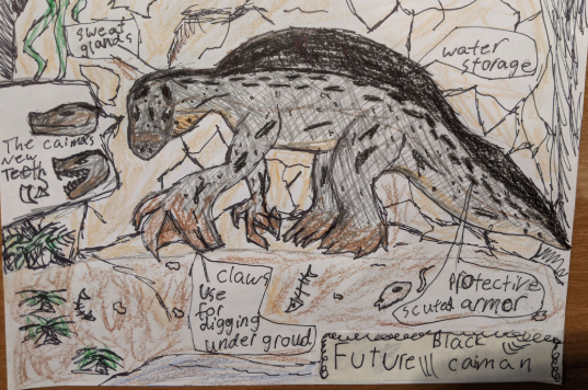 In its habitat, the caimans main reliances on water will become insufficient and will become a drag for the animal due to global warming. The adaptations I have made for the animal can help it live better in dryer places. The back of the caiman now has a spine that holds water. The black caiman also now has sweat glands to cool off for the heat. The animal now walks similar to an ant eater walking on its knuckles and using its claws to dig under ground. Its teeth have grown to shred and cut apart meat so the main hunting strategy will no longer work in the shallow water, and now it brings down the prey by hunting it down. The size of the black caiman has decreased down to a medium sized dog but has protective scales/scoots to make sure it's protected from predators.