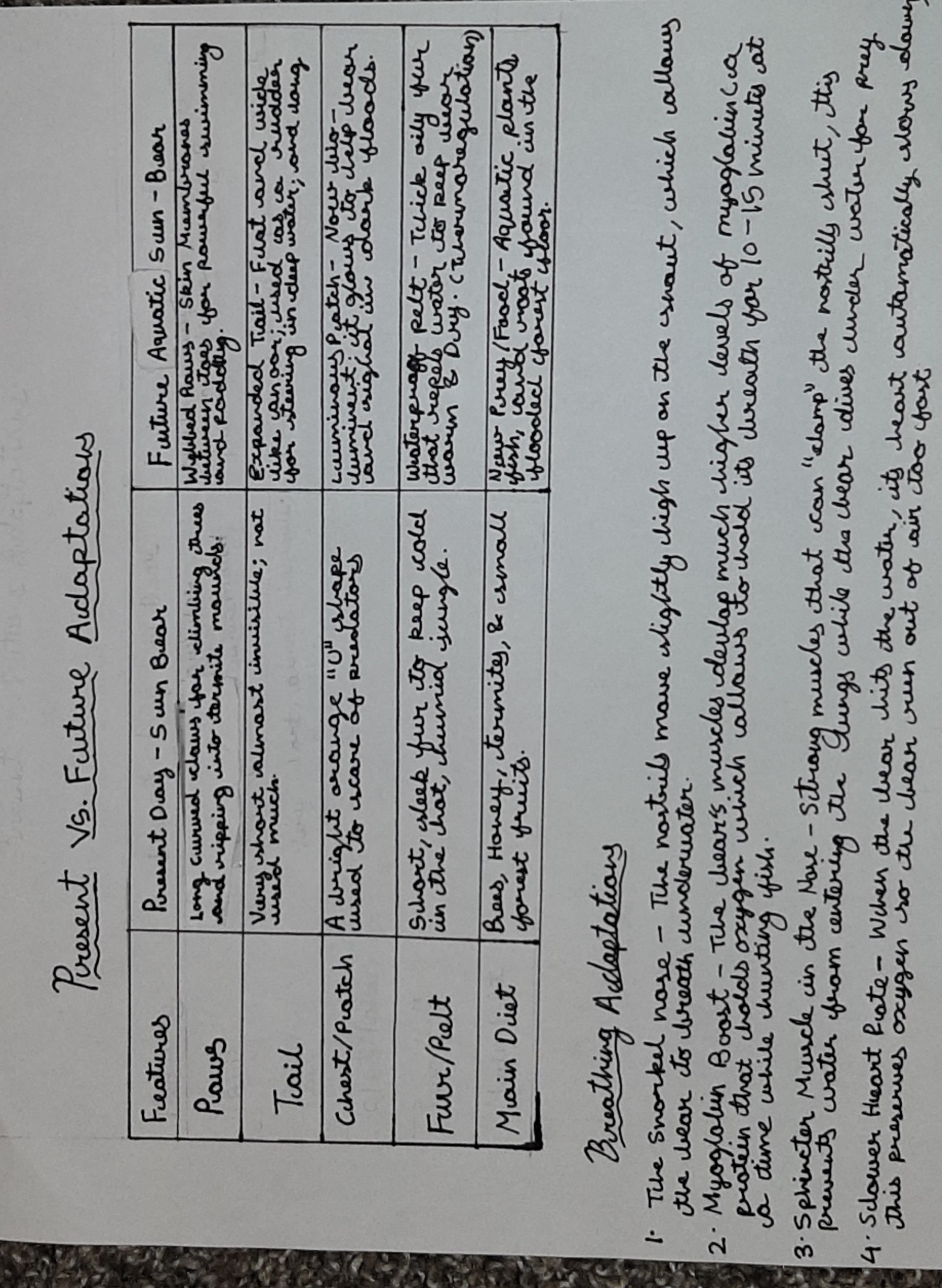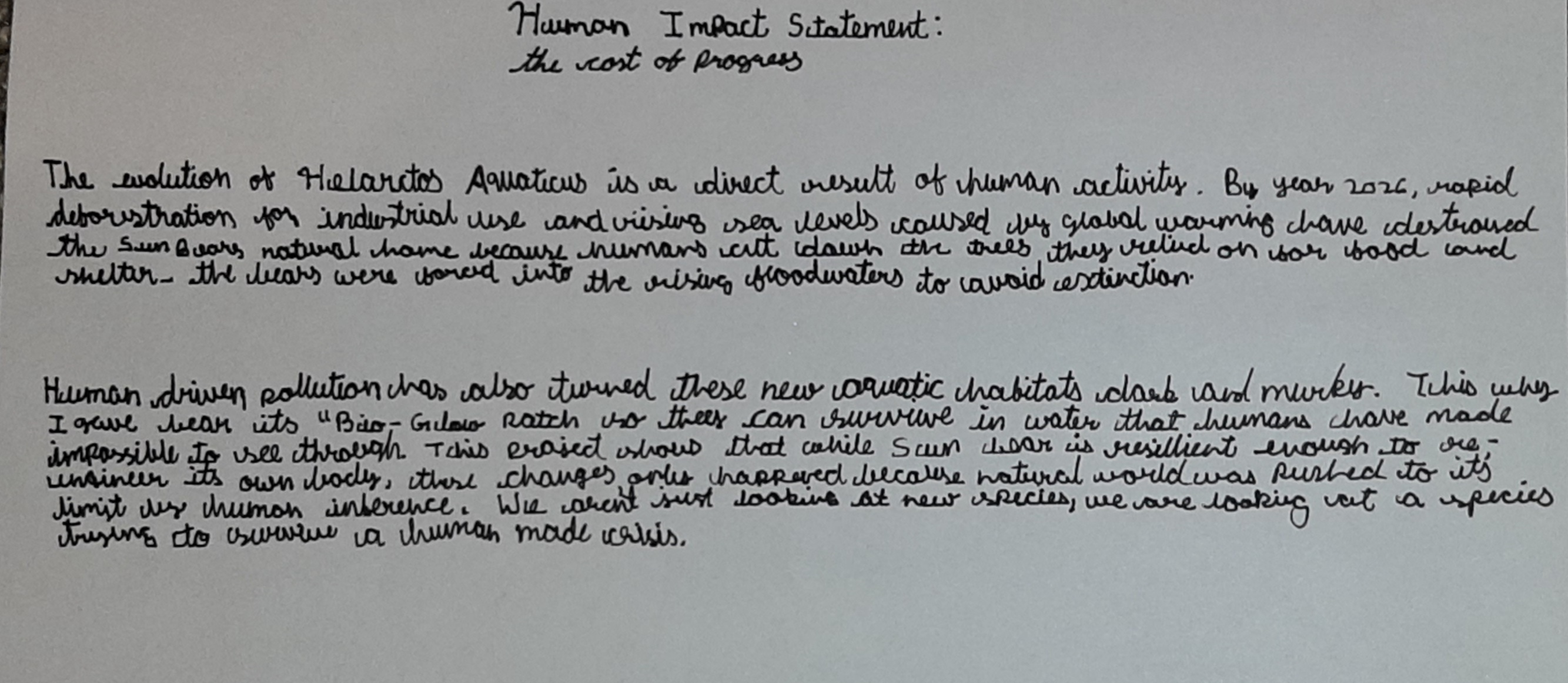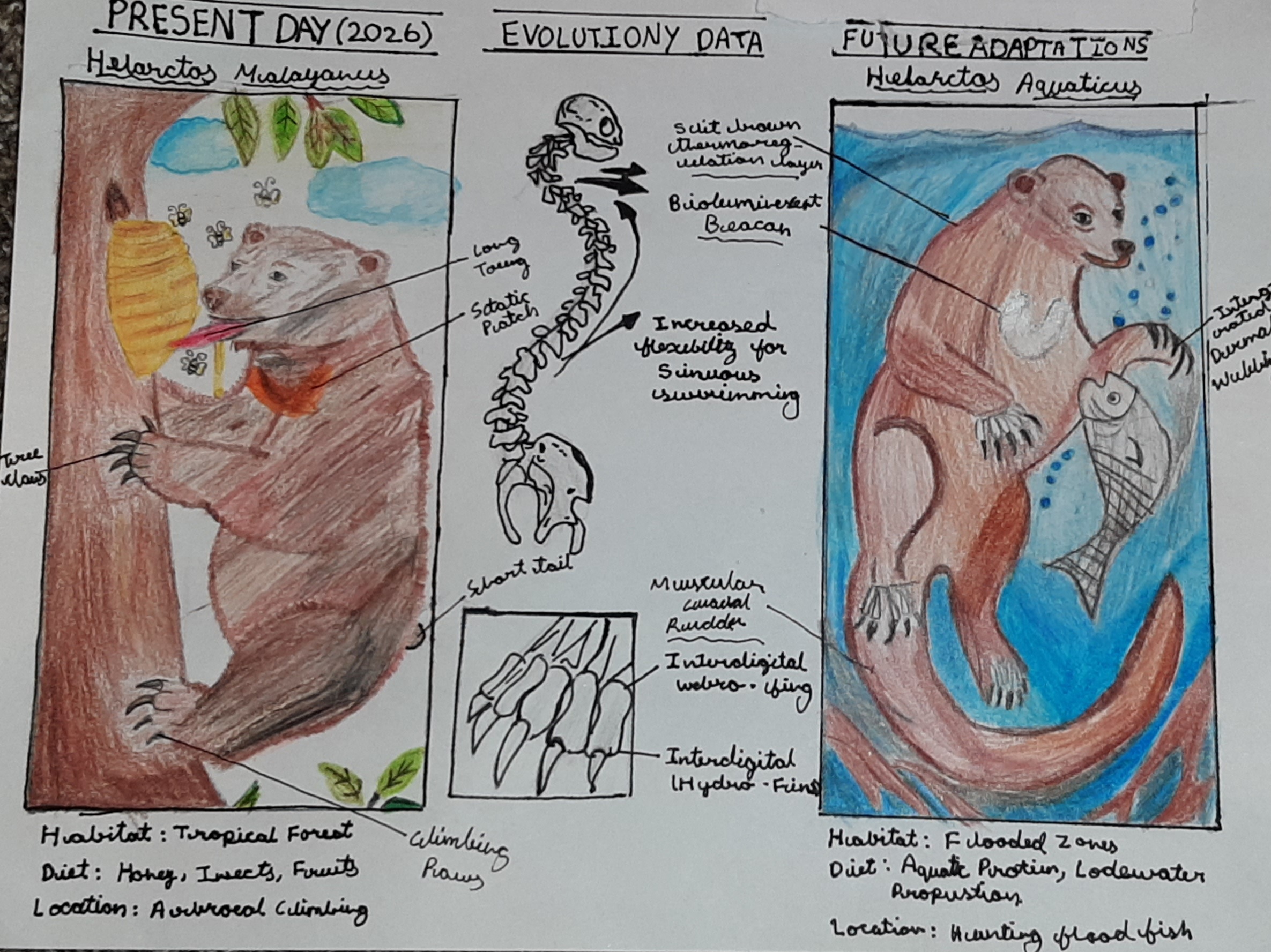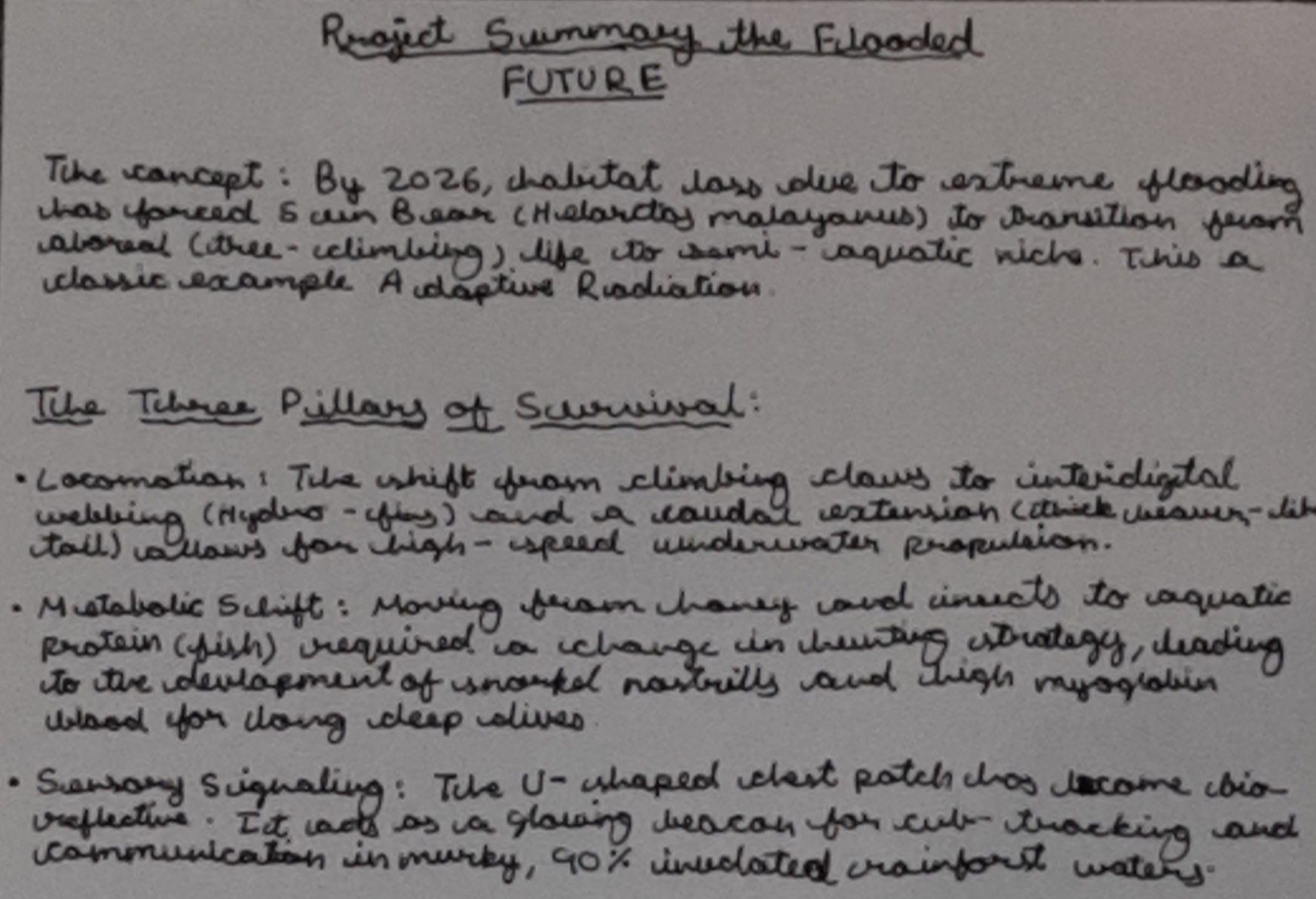 By the year 2026, humans have significantly impacted the survival of the Sun Bear, now known as Helarctos aquaticus. Due to deforestation and rising sea levels from climate change, 90% of their home is flooded. Since humans destroyed the trees they once climbed, I re-engineered their bodies to move from the canopy into the deep water to survive. One major change I designed was adding thick webbing between their toes to create "Hydro-Fins," turning their old climbing claws into powerful paddles for swimming. I also gave them a muscular tail to help them steer while chasing fish. Since human-driven pollution makes the water murky, I made their orange chest patch glow like a beacon so families can find each other. Their fur also evolved from black to silt-brown to blend in with the muddy river water. My goal was to show how animals must adapt to a human-altered world.
