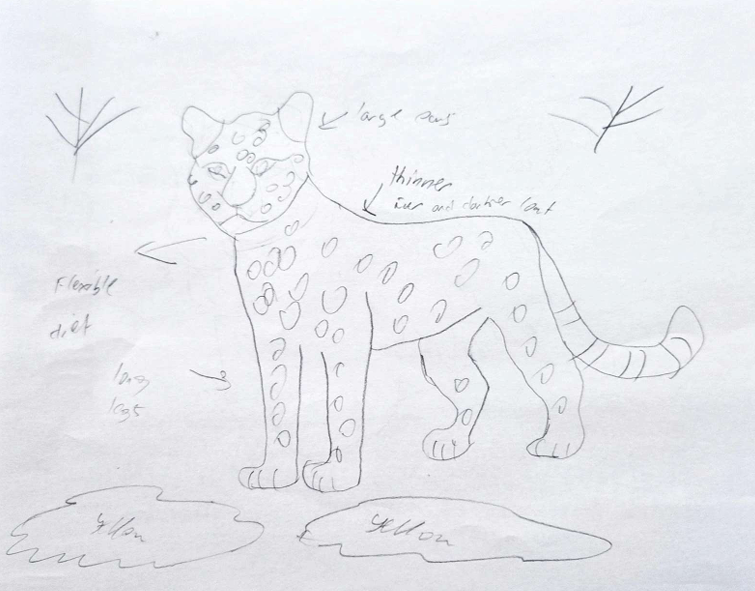 The jaguar is living in the Amazon Rainforest of South America, where it hunts in the forests near rivers and wetlands. It is an aggressive mammal with really good traits such as strong muscles, powerful jaw, sharp claws and golden fur covered in black spots for camouflage. The climate change might make the rainforest hotter and drier, causing a loss of habitat and prey animals. In response the jaguar may develop thinner fur to release heat. Another adaptation includes the change of larger ears for better cooling the body. If the forests get more spread out, it might get them to develop longer legs to make long distance more manageable. They might also develop a flexible diet since because of the dry weather many preys are dying. This adaptation will make sure that the new environment is comfortable for the jaguar to live and reproduce.