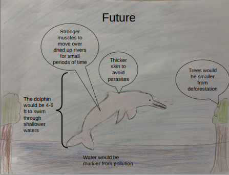 The Pink River Dolphin lives in the Amazon and can be up to 9 feet long. As the Amazon has more and more droughts, the rivers that this animal calls home are beginning to dry up. In order to survive, the Dolphin will have to be smaller and stronger to swim through shallow rivers and make it over small patches of land. They will also have to develop thicker skin to protect them from parasites spreading in the dirty still water. Amazon River Dolphins are already endangered as it is and they will have to adapt to major changes in their habitat in order to survive.