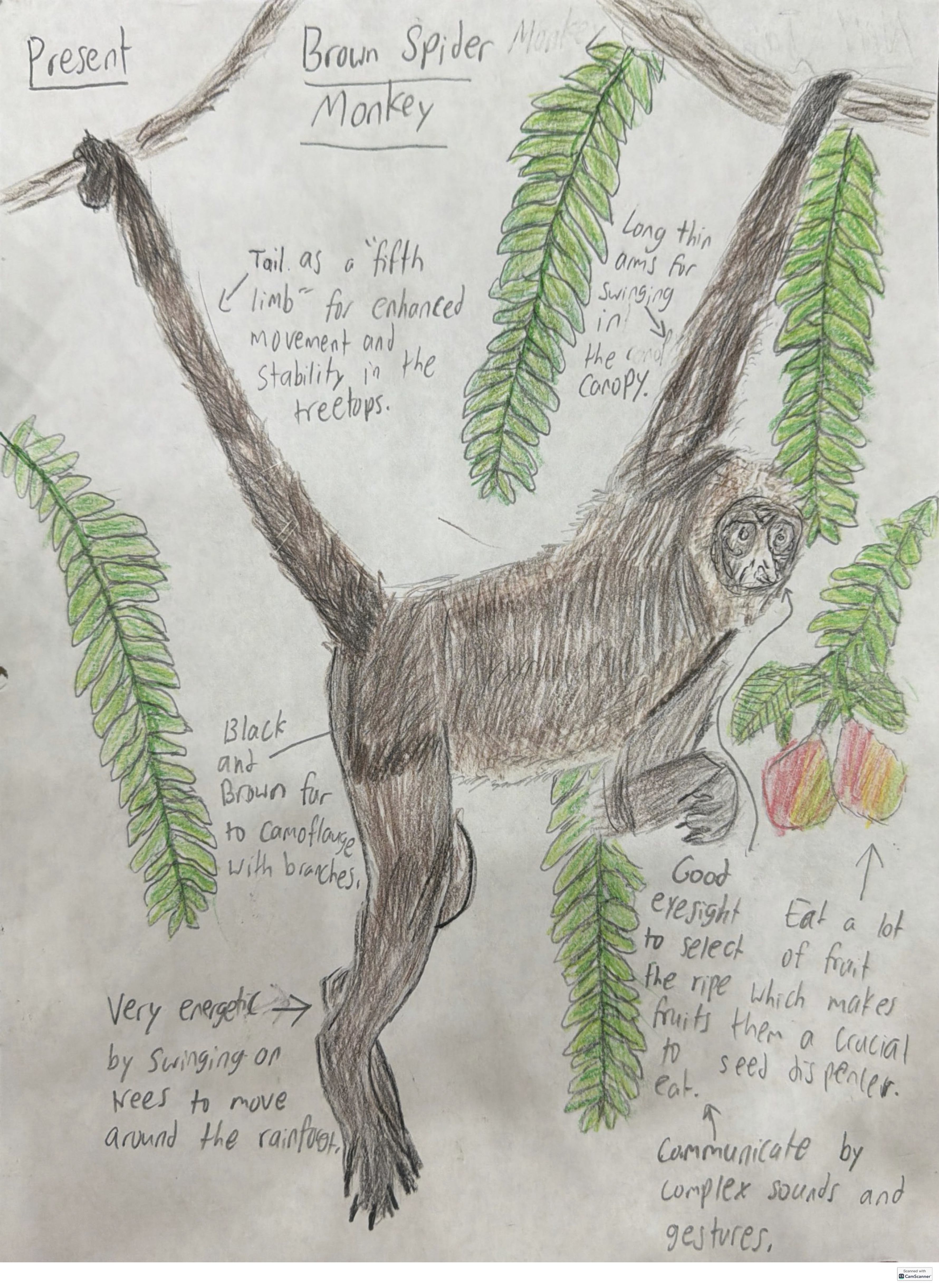 The brown spider monkey is a rainforest species whose survival depends on specialized adaptations. Today it lives high in tropical canopies where dark brown fur helps it blend with tree trunks and shaded leaves. Long slim arms legs and a powerful prehensile tail used like a fifth limb allow efficient swinging between trees. Excellent eyesight helps it locate ripe fruit as its primary food source. Brown spider monkeys live in large social groups but often forage in smaller units communicating through complex calls, expressions and gestures.