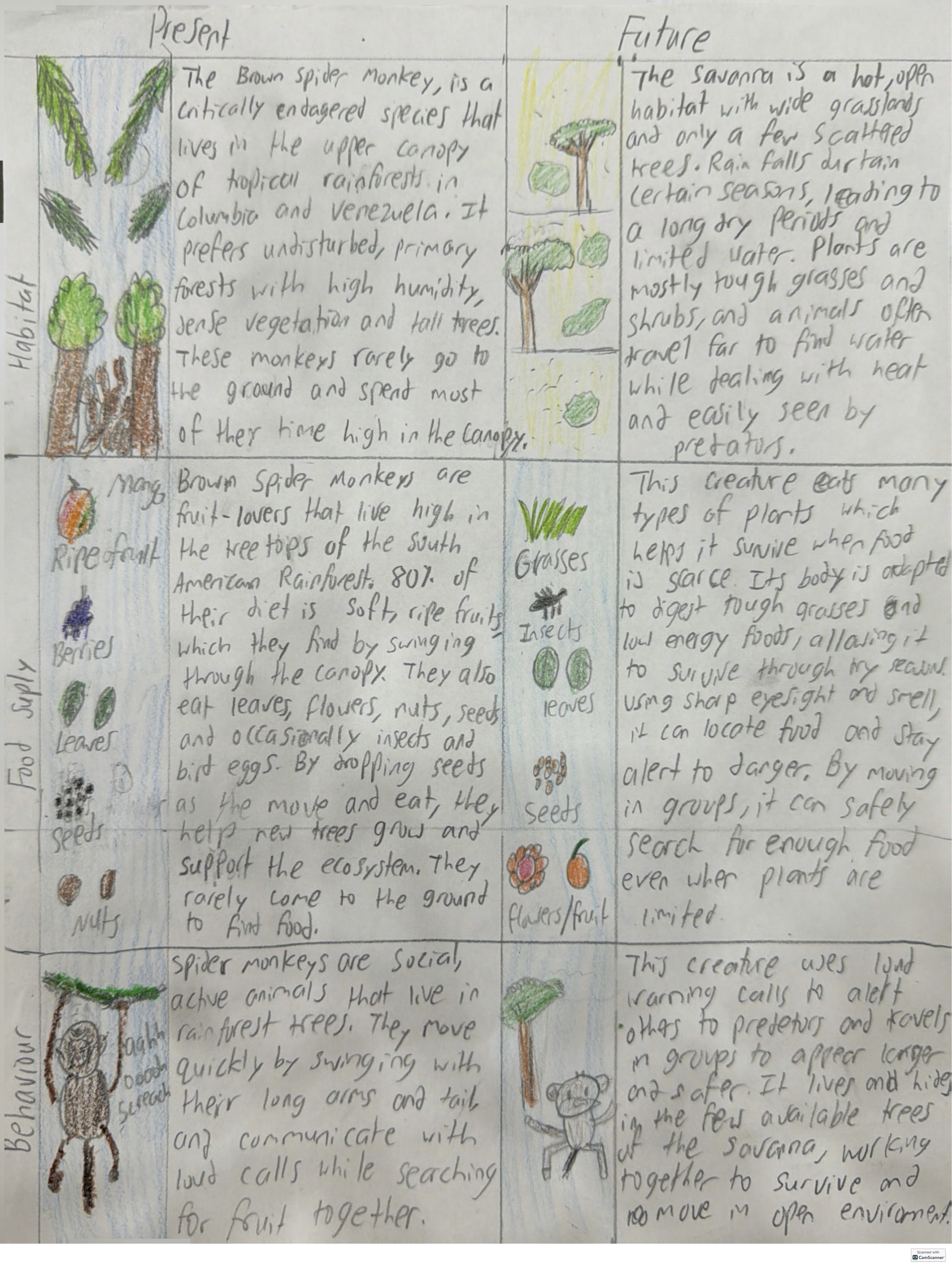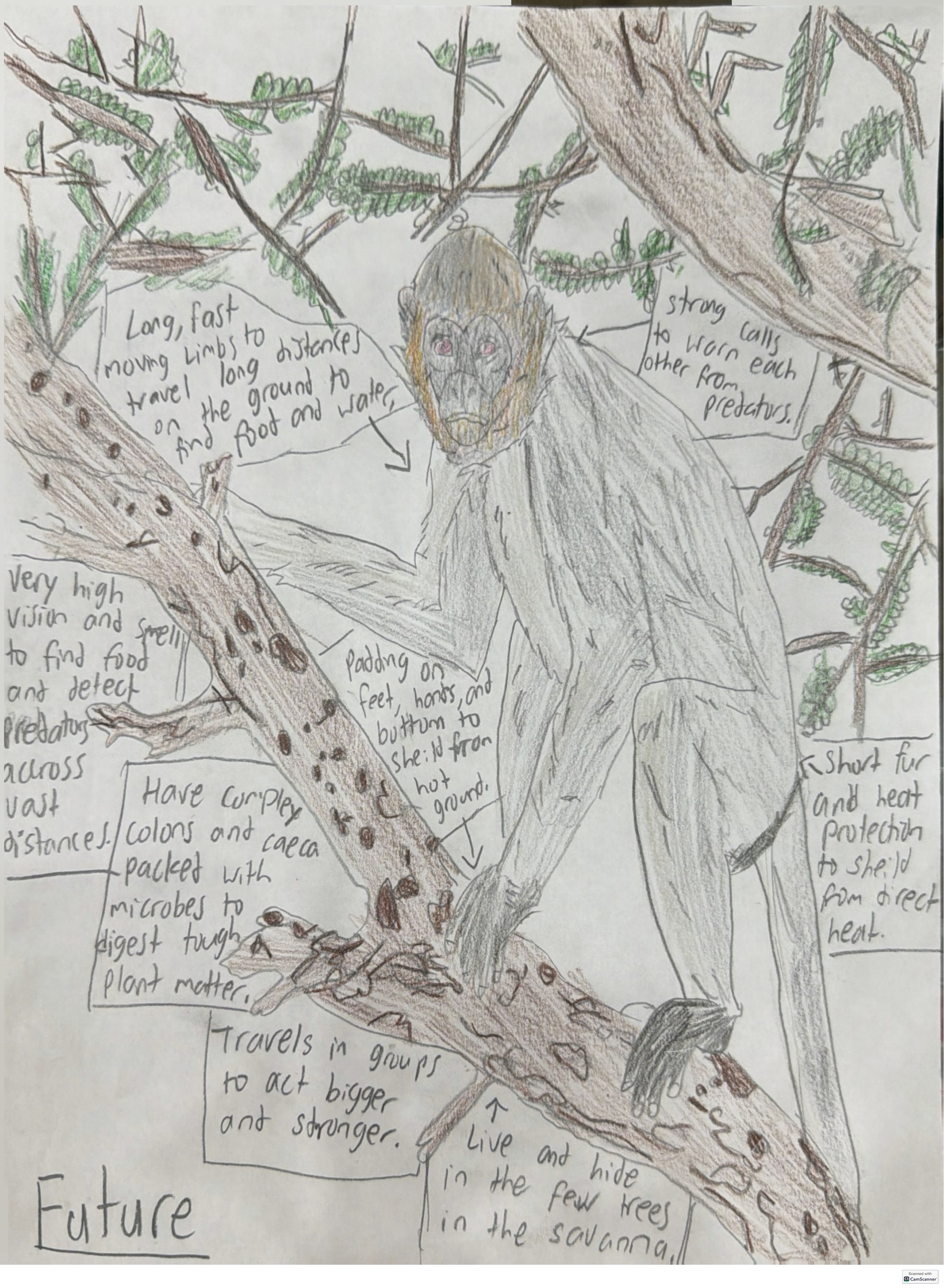 In the future deforestation fragments forests and creates hotter, more open canopies. Its coloration shifts toward grey, improving camouflage among bare branches and reflecting heat. As fruit becomes scarce it eats tougher plant matter including leaves bark and fibrous stems. The digestive system adapts with a stronger more complex gut that breaks down these foods.