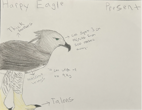 Today the harpy eagle is one of the most powerful raptors in the tropical rainforests of Central and South America. It has talons, strong legs, and broad wings that help it fly through dense forest while hunting monkeys, sloths, and other tree animals. Its dark feathers help it blend into the canopy and surprise prey. In the future climate change and warming forests could push harpy eagles to adapt in several ways. As shown in my design the eagle develops longer wings that allow it to glide farther using less energy in hotter temperatures. Its feathers become thinner and darker, helping release heat while still providing camouflage in the canopy. The talons grow larger for catching tougher prey as habitats change. It may also hunt over wider areas, move to cooler higher elevations, and build nests in new locations while becoming more territorial to protect limited food and nesting space.