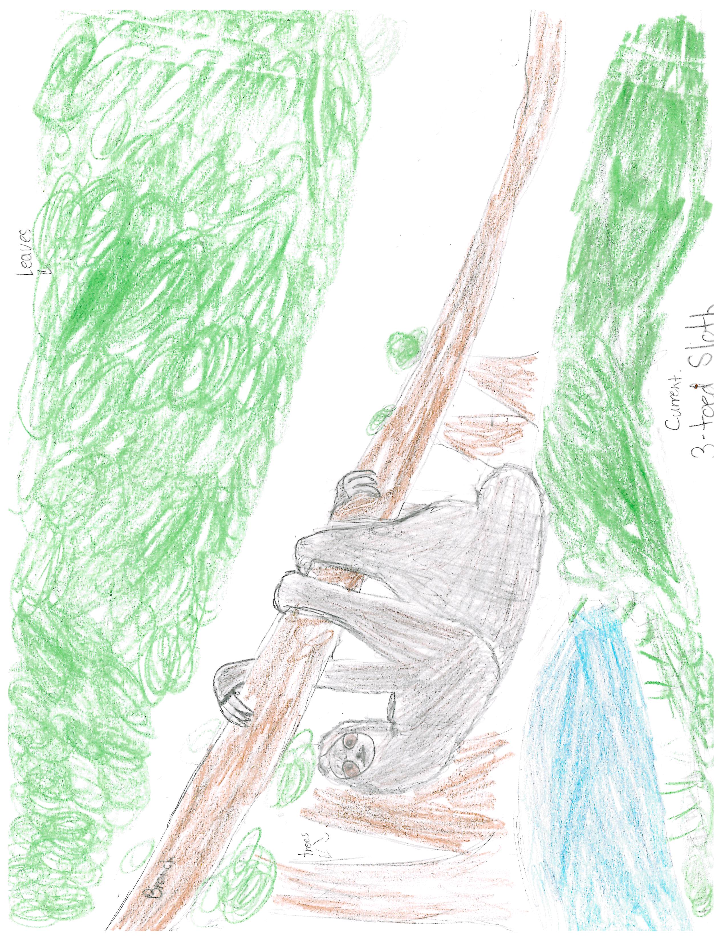 I chose the three toed sloth from the Amazon Rainforest.The 3 toed sloth has three claws, five hind toes, short tail, and thick, shaggy, grayish fur, that hosts algae providing camouflage. The three toed sloth lives in canopies that they rarely leave, feeding, sleeping, and even giving birth up there. The tree toed sloth is a herbivore with a slow metabolism allowing it to sleep 14 to 20 hours a day. I have predicted the three toed sloth will live on the ground, speed up their metabolism, and become omnivores. It will have a strong head for protection. It will look dumb as a way to not look like a predator tricking the prey. I think this because the sloth will need to adapt to survive and hunt. The Amazon Rainforest will become a safari because of global warming. That is my report on the three toed sloth.